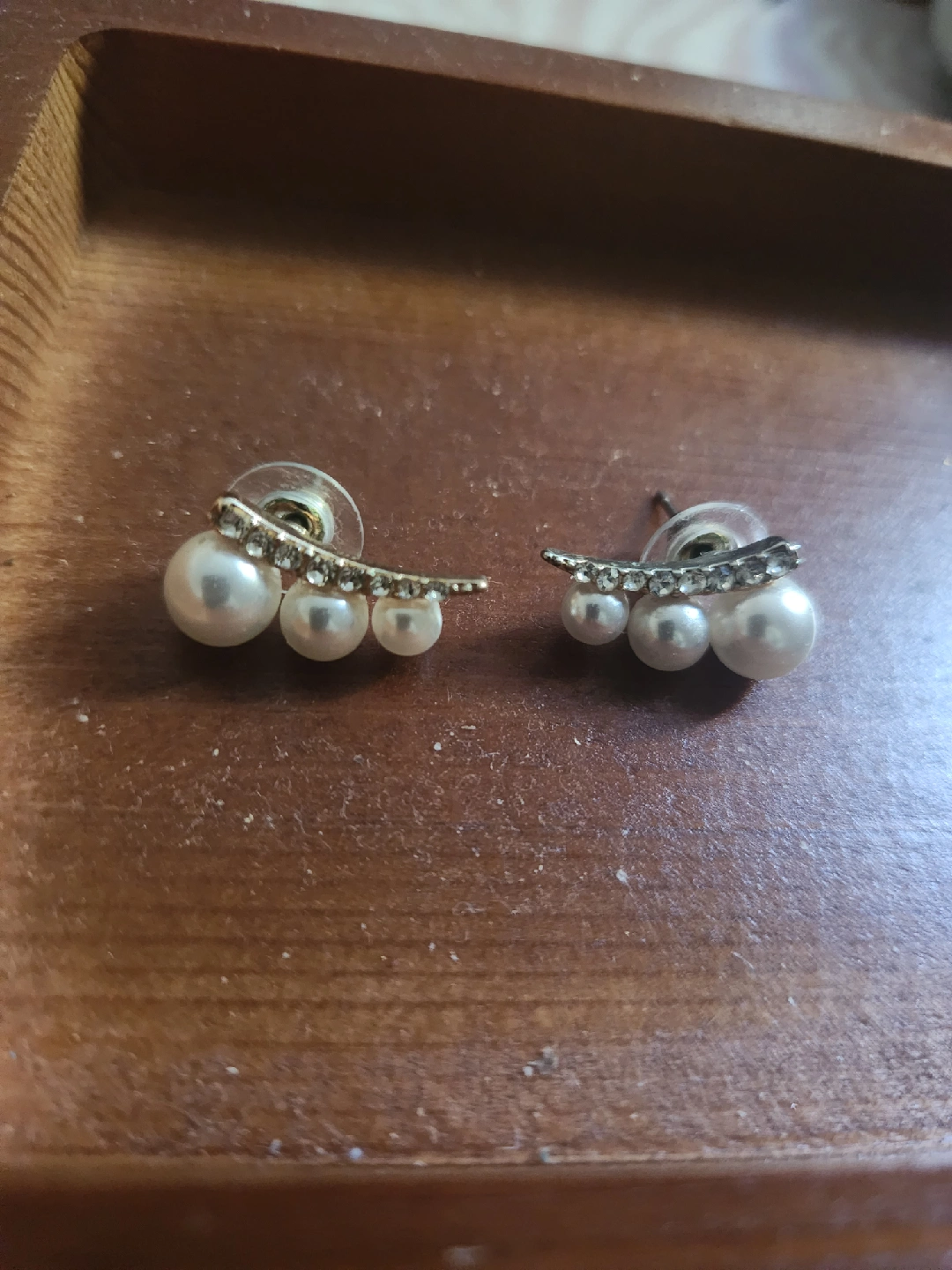 These are a pair of pearl earrings. Regular price = $10.00 on sale $8.00.They have a curved row of rhinestones above the pearls, adding a touch of sparkle. They are in great condition and would be a lovely addition to any outfit! Dm to pickup.