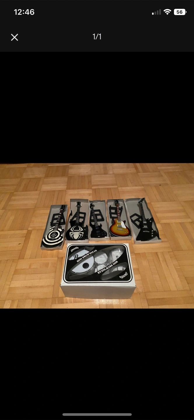 Selling a Pearl mini drum gear and guitar set. It comes with five guitars and a mini drum set, all still in their original packaging!