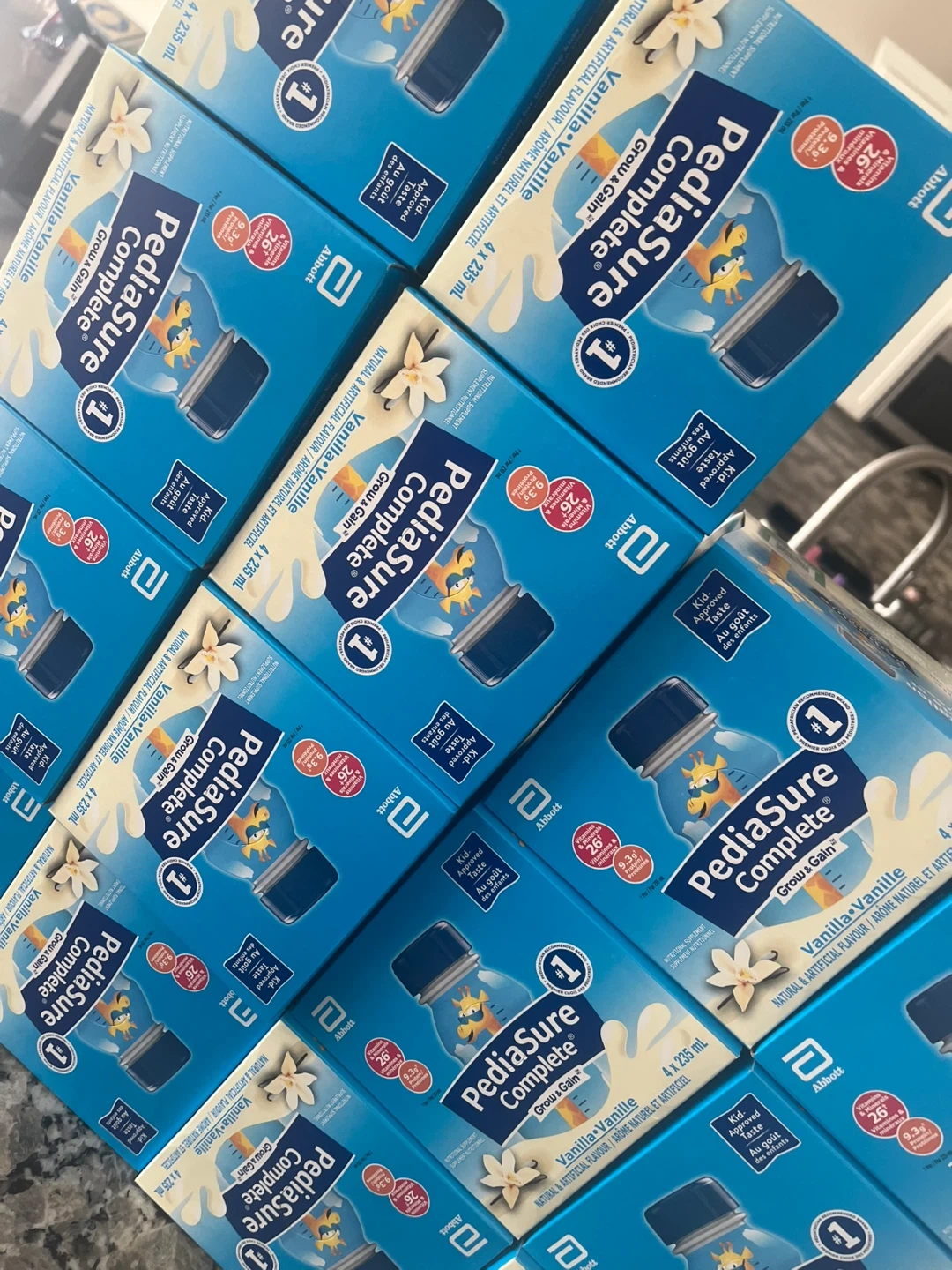 Selling PediaSure Complete Grow & Gain in Vanilla flavour! These are 4 x 235mL bottles. They contain 26 vitamins and minerals, plus 9.3g of protein. Kid-approved taste!