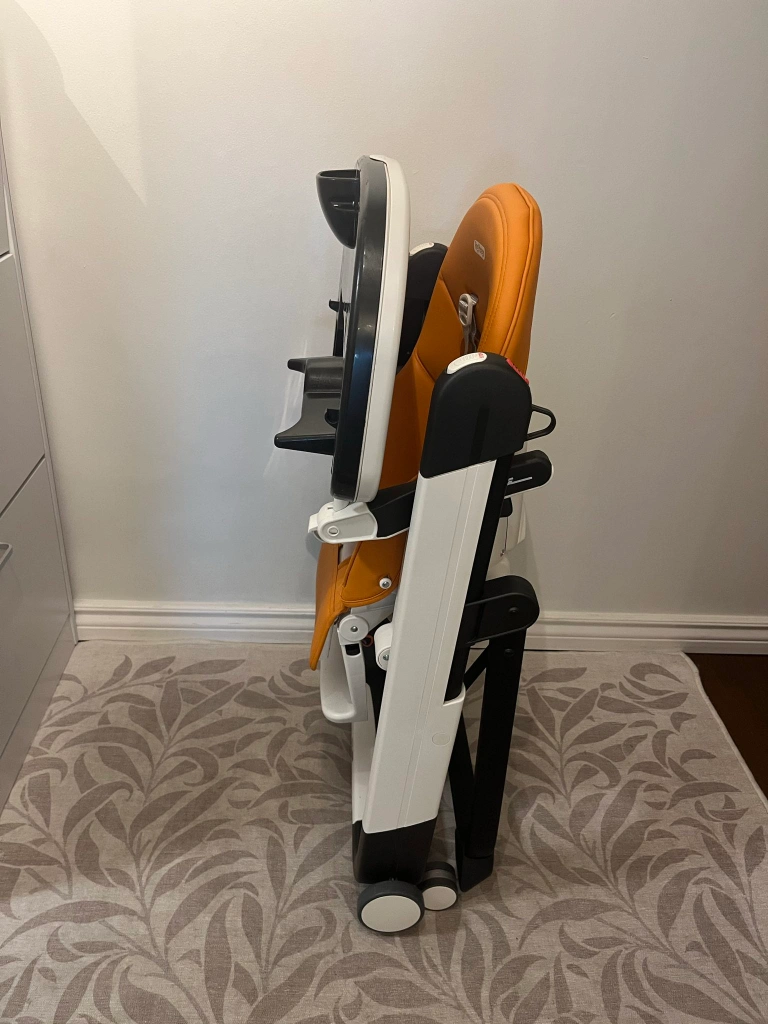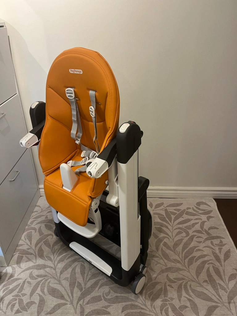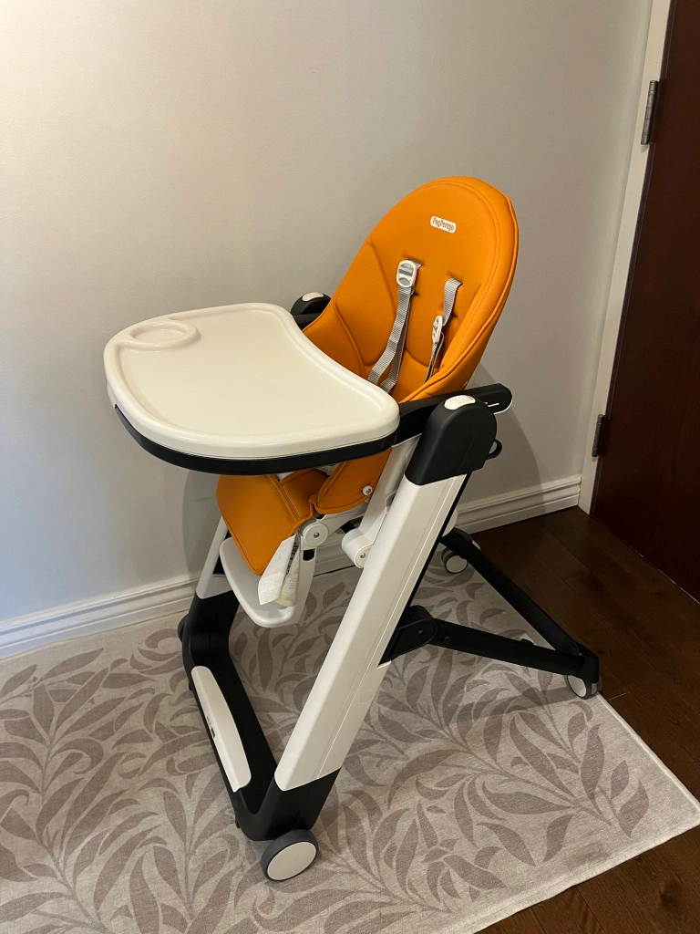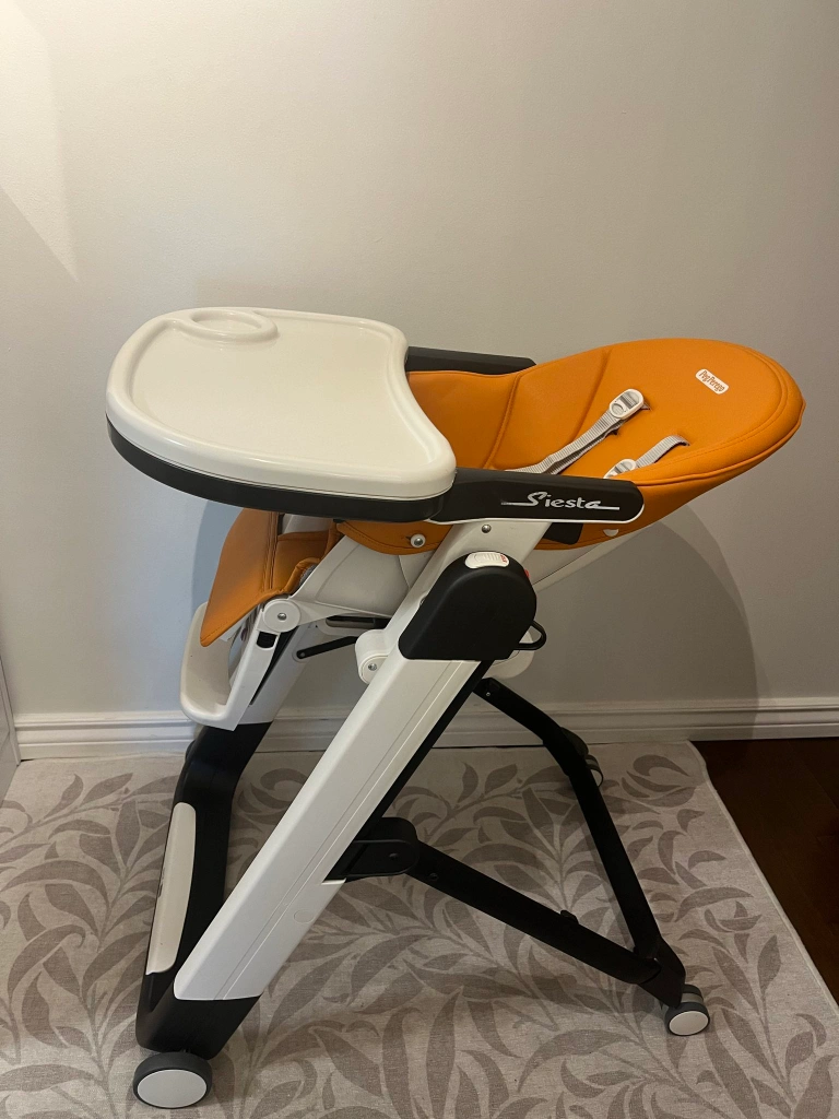 Selling a Peg Perego Siesta high chair in great condition! It's a versatile chair that can be used from newborn to toddler age. The chair is orange and has a white frame with black accents. It's easy to fold and store, making it perfect for smaller spaces. The seat is comfortable and easy to clean, and the tray is removable for easy feeding and cleanup.