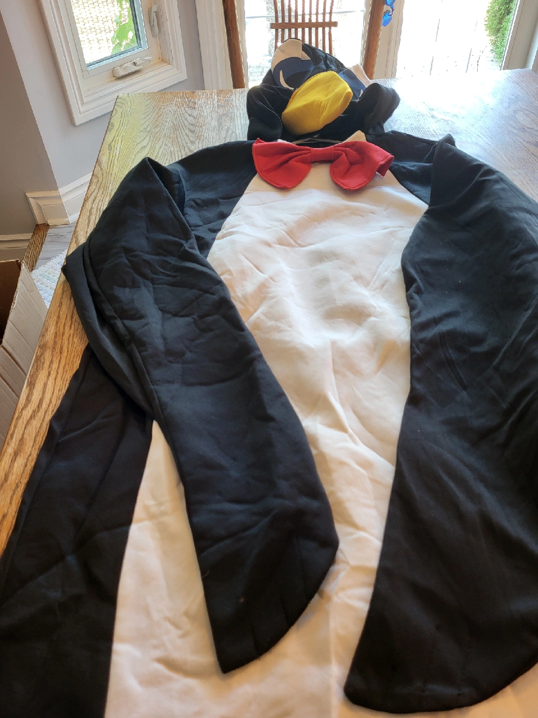 A cute penguin costume, perfect for dress-up or Halloween! It features a black and white body, a yellow beak, and a red bow tie. It's in great condition and ready for a new home