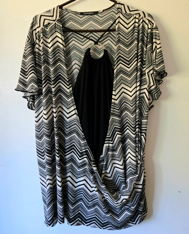 Cute Penningtons top with a black and white chevron pattern! It has a black inner lining and a flattering wrap style. Perfect for a casual day out or dressing up for an evening out! Excellent condition.