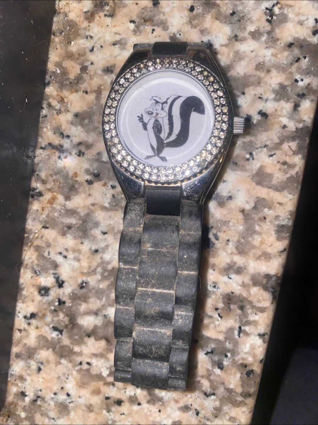 Selling a cute Pepe Le Pew character watch! It has a black band and a silver-tone face surrounded by rhinestones. It's in used condition, but still has lots of charm! Collect it for nostalgia etc. Located in Monck Ontario 15 minutes away from Arthur Ontario.