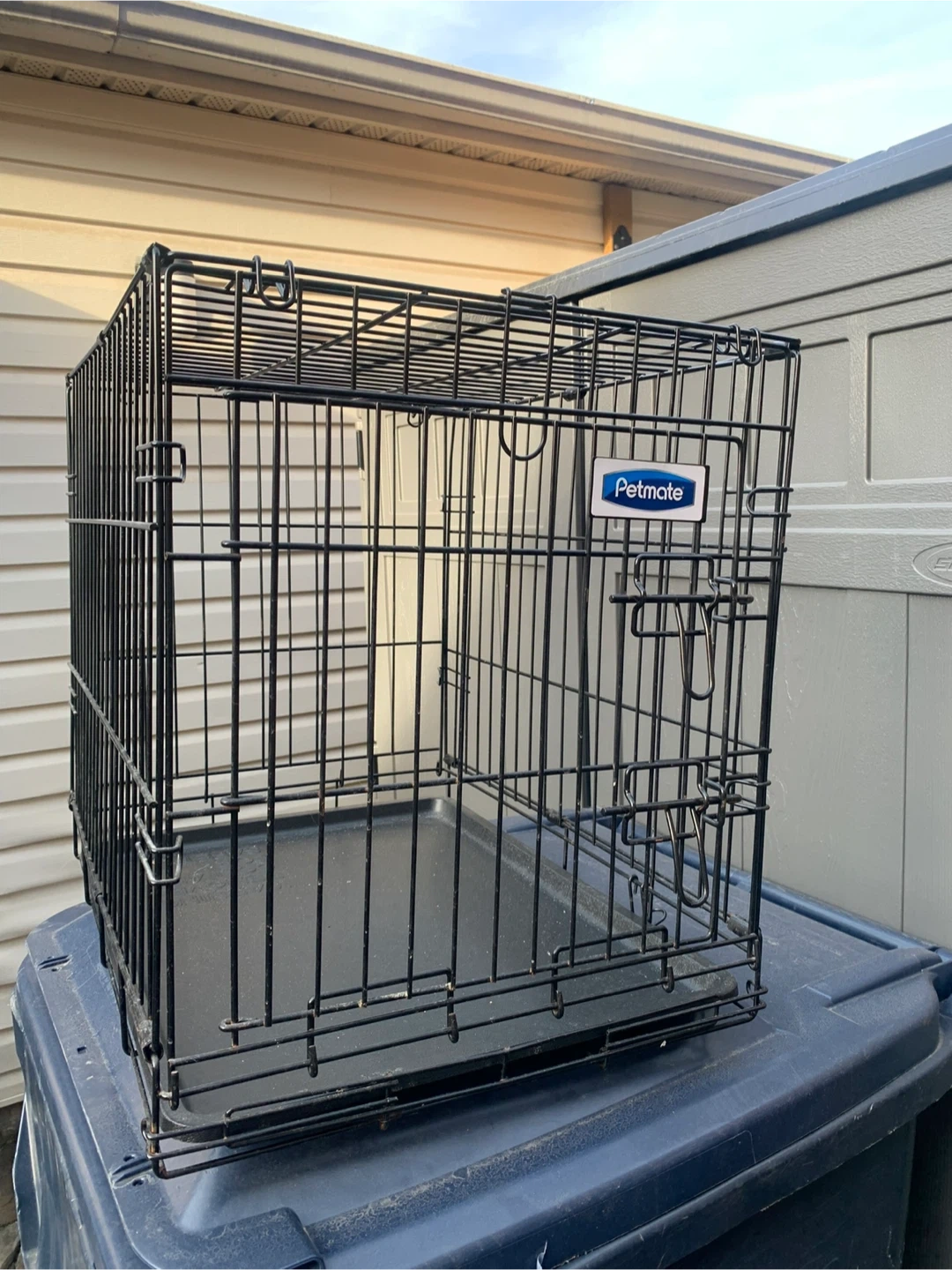 Selling a Petmate dog crate in good condition! It's a sturdy and reliable crate, perfect for training or travel. It's black and has a plastic tray at the bottom for easy cleaning. Ready for a new furry friend!