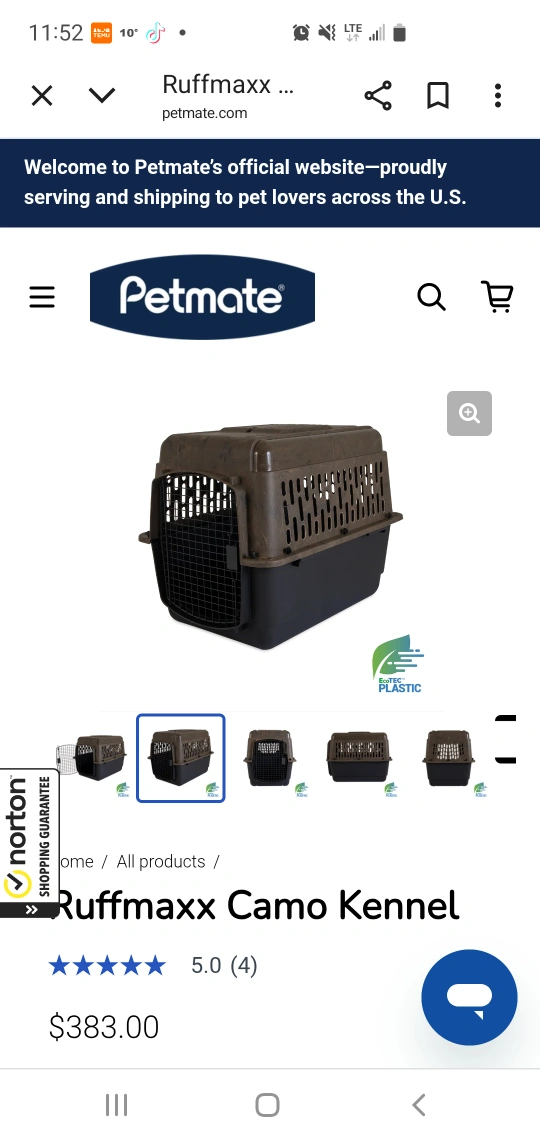 Selling a Petmate Ruffmaxx Camo Kennel in the 40-inch size. (XXL) fits dogs around 70-90lbs although my 120 lb sheppard fit no problem!! it's in good usable shape and ready for your furry friend! Made with eco-friendly pre-consumer recycled plastic, it measures approximately 40" L x 27" W x 30" H, meets IATA and USDA requirements for air travel, and is available in a camouflage color for outdoor-focused pets.