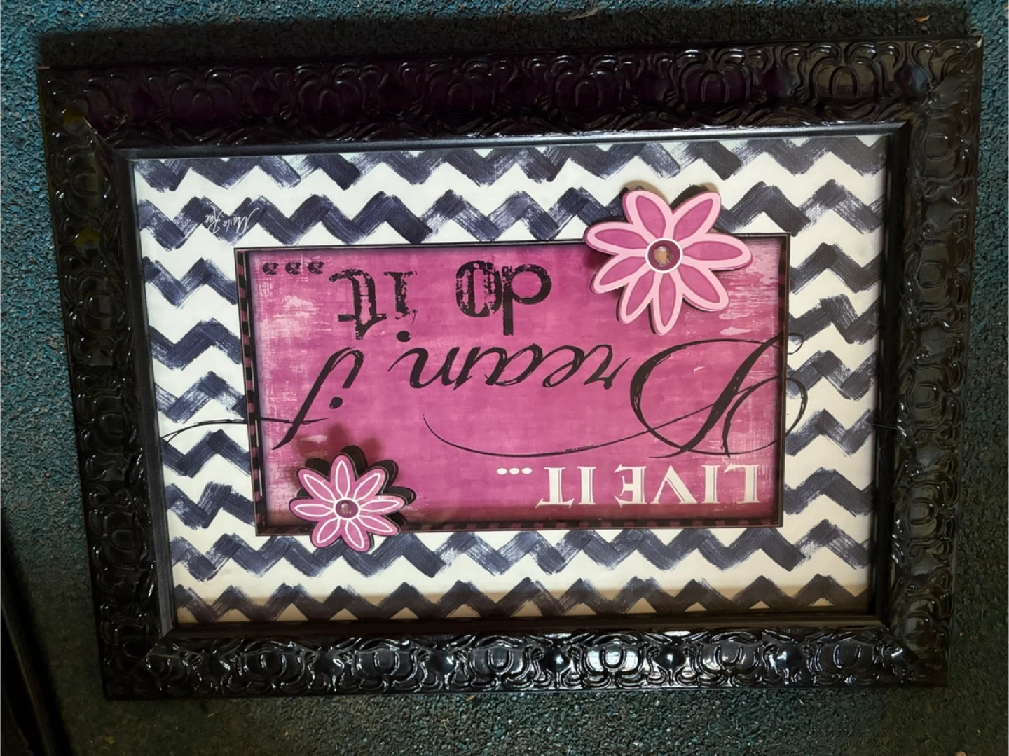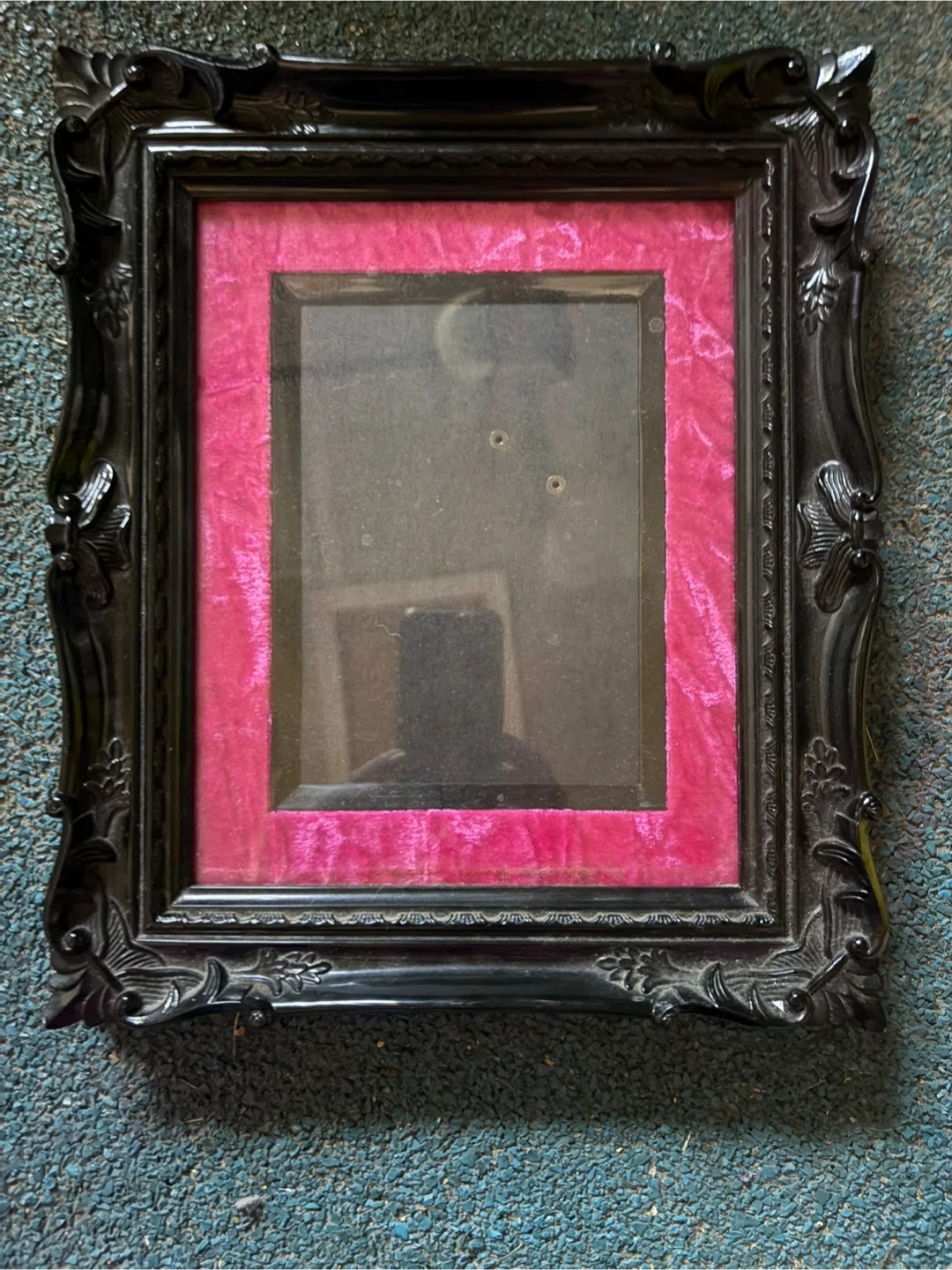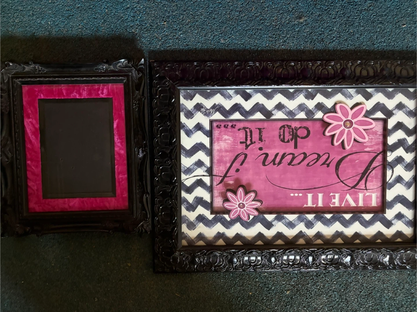 Two picture frames up for grabs! One has a pink velvet insert and the other has a cute design. They're in great shape and ready to display your favourite photos or artwork