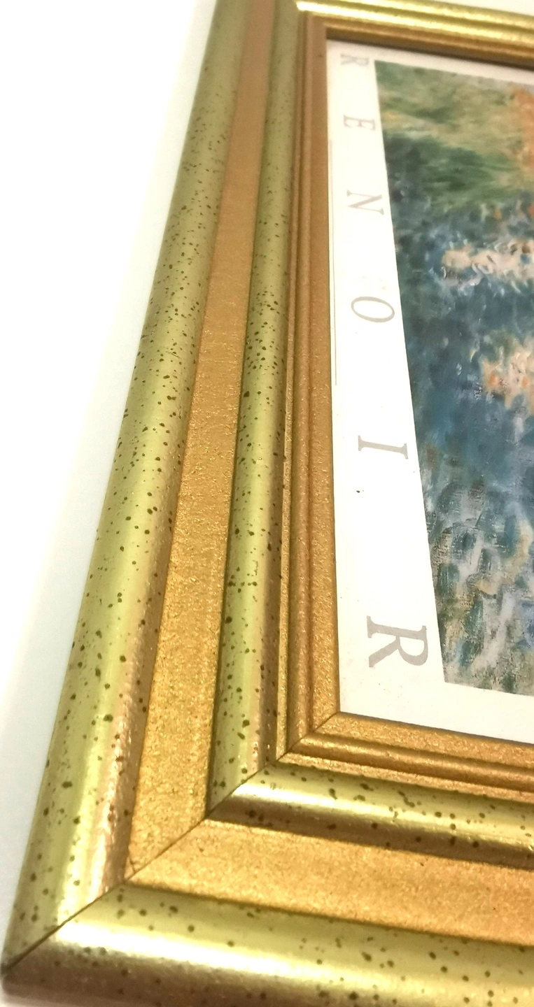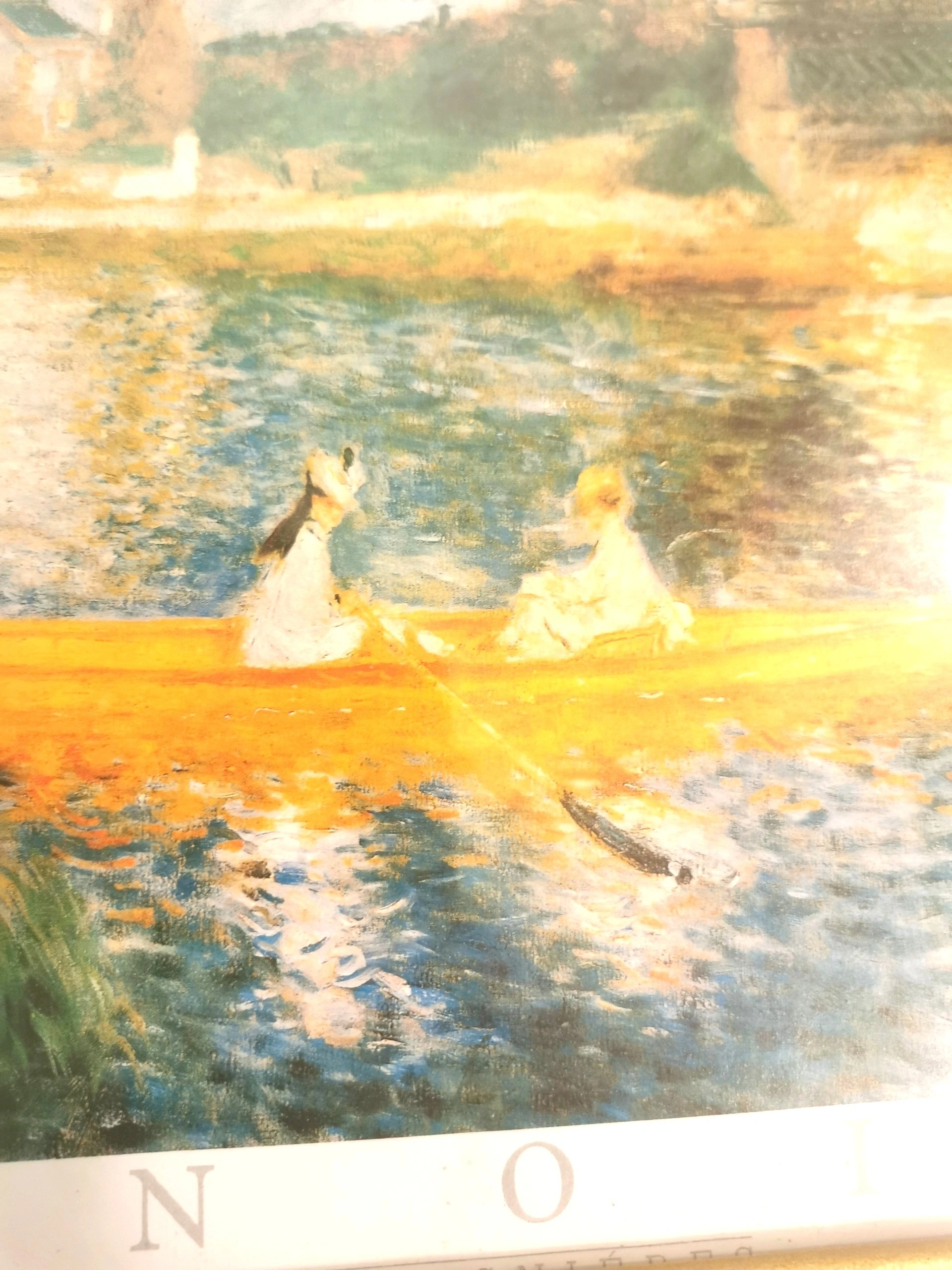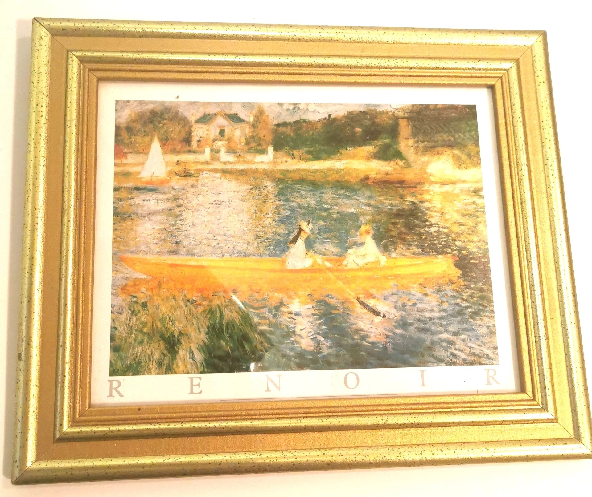 Medium-sized print by artist Pierre-Auguste Renoir titled "The Skiff" from the Adventure Time series. It is a lithograph on paper, framed in gold, depicting daily life on the water in a classic style. The print measures 10 inches in length and 12 inches in width, with a height of 0.5 inches. Produced in the United States in the 1980s, it showcases people in a maritime setting. NOTE: Good vintage condition one small blemish on the frame please reference photos as they are part of the description of the print.