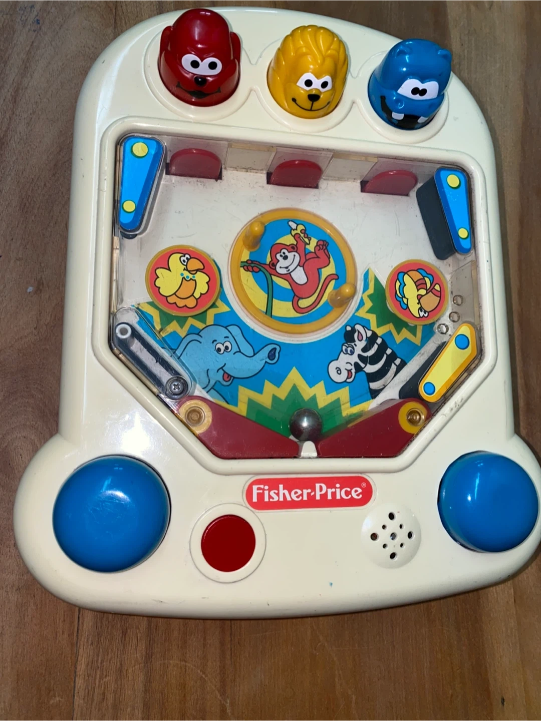 Selling a used Fisher-Price Animal Friends Pinball game. This classic toy features a fun animal theme with a red bear, yellow lion, and blue hippo at the top. It's perfect for kids to develop their motor skills and have a blast! Note: Suits older kids (6+) that can hit hard. 10âx9â for tabletop or floor. Uses (2) C-cell batteries.