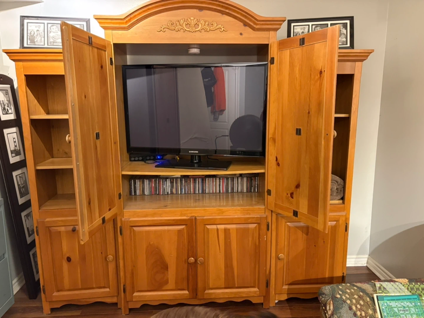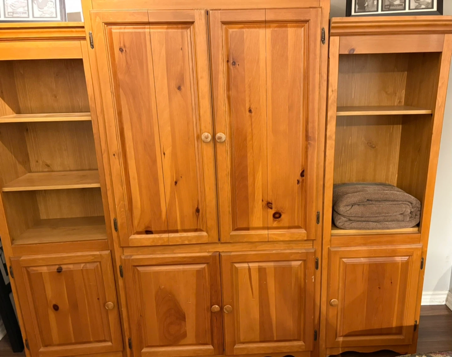 Selling a solid pine wood entertainment unit. It features a central cabinet area with doors, shelving on either side, and lower cabinets for storage. Great for organizing your living room!