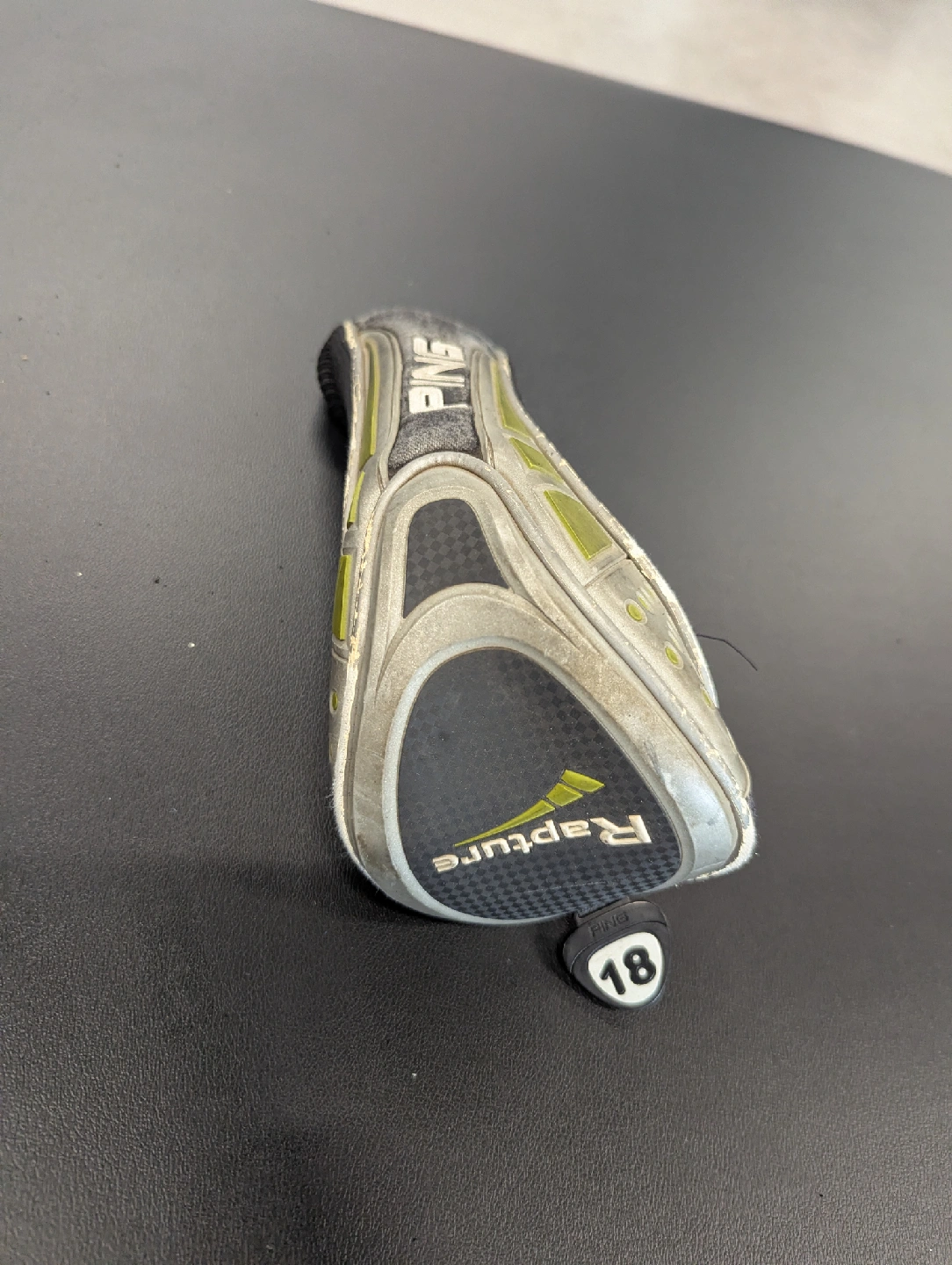 Selling a used Ping Rapture golf club head cover. It shows some signs of wear, but it's still functional and ready to protect your club. It has the number 18 on it as well