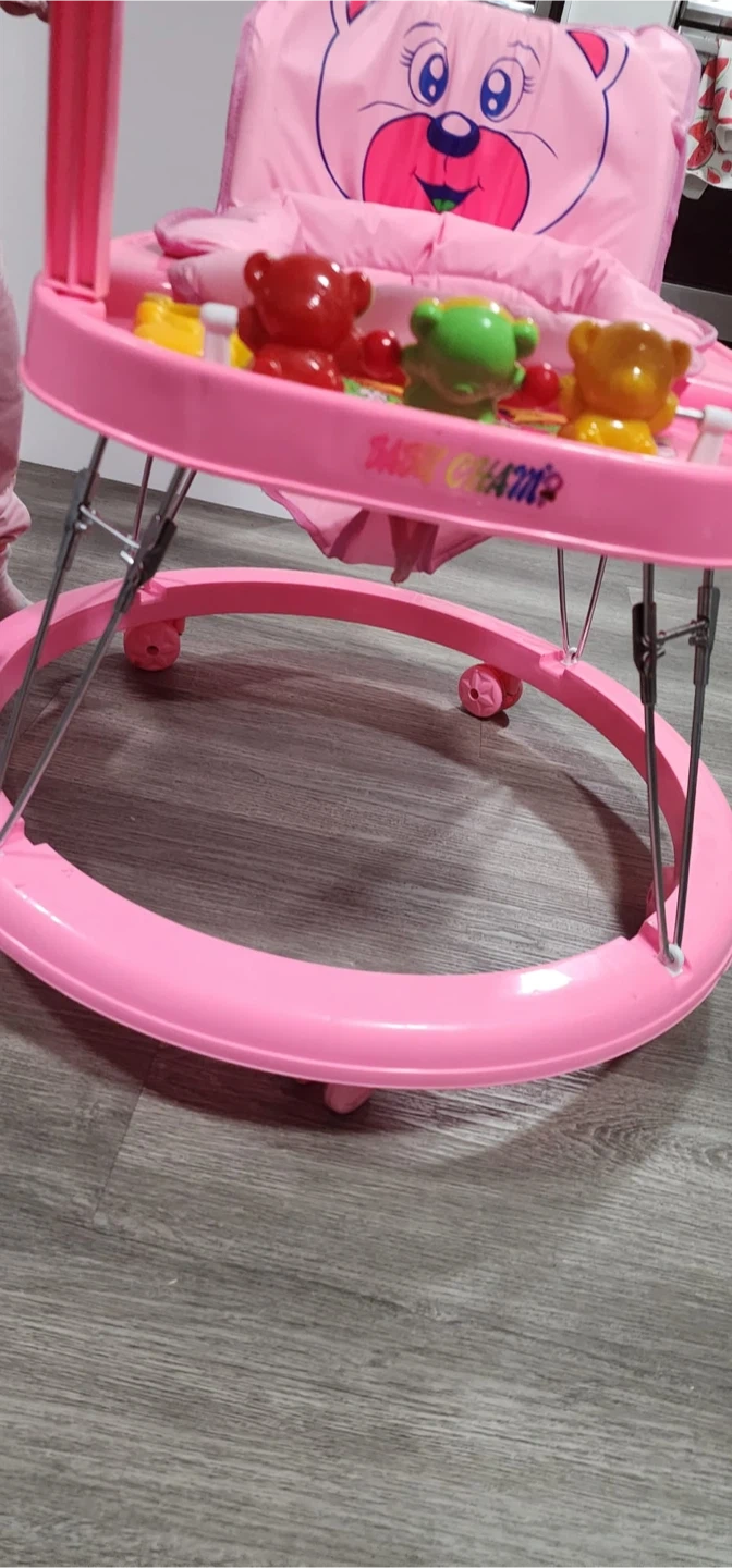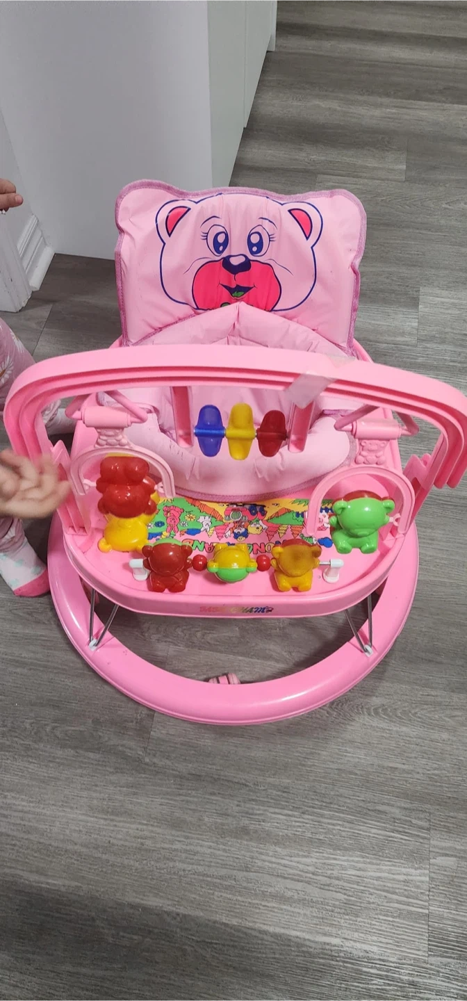 Selling a cute pink baby walker! It comes with a comfy seat and fun toys to keep your little one entertained. Perfect for helping your baby take their first steps! Little rips but it’s in good conditions!