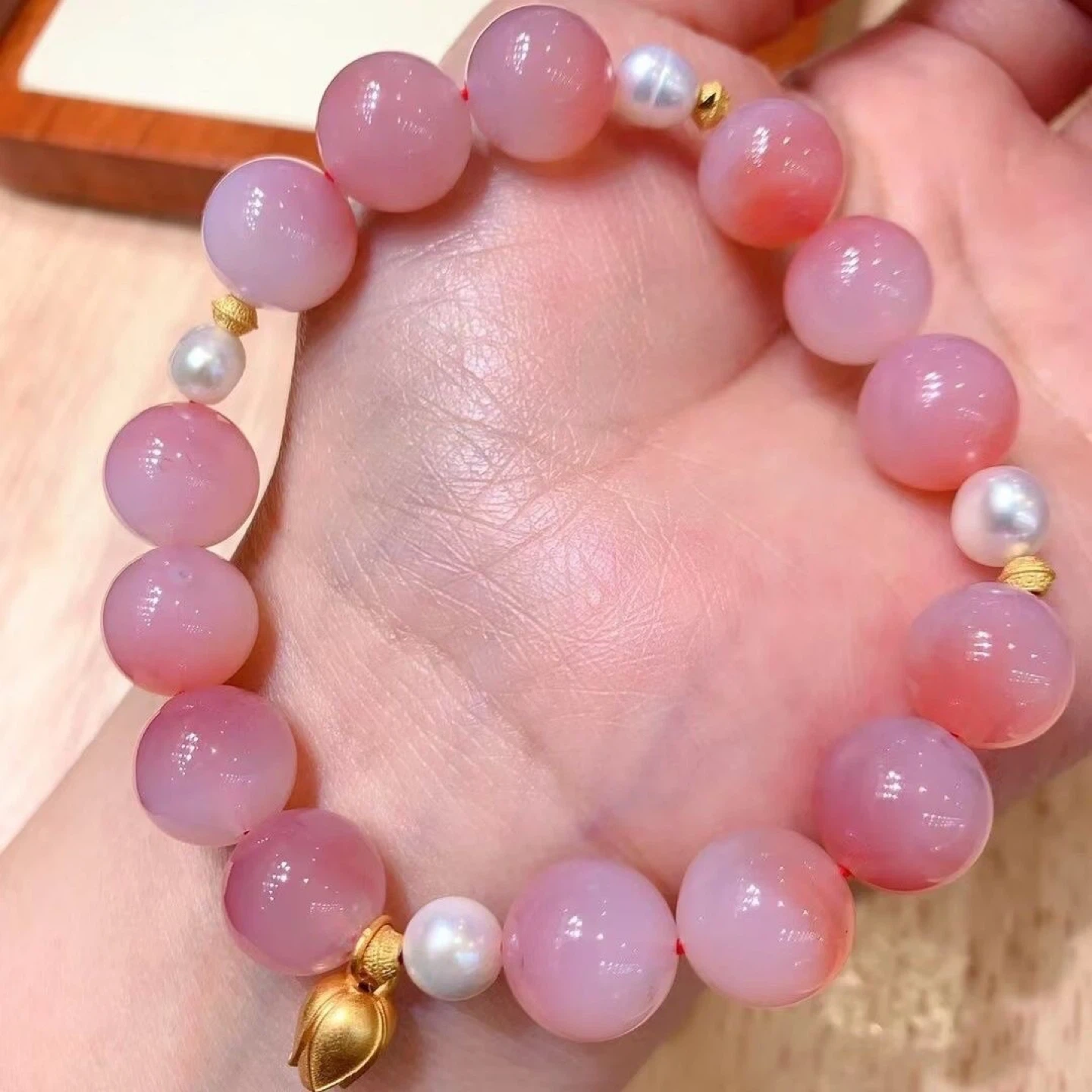 Selling a pretty pink beaded bracelet. It features round, light pink beads complemented by small white pearls and gold-toned accents. A unique lotus-shaped charm adds a special touch to the bracelet