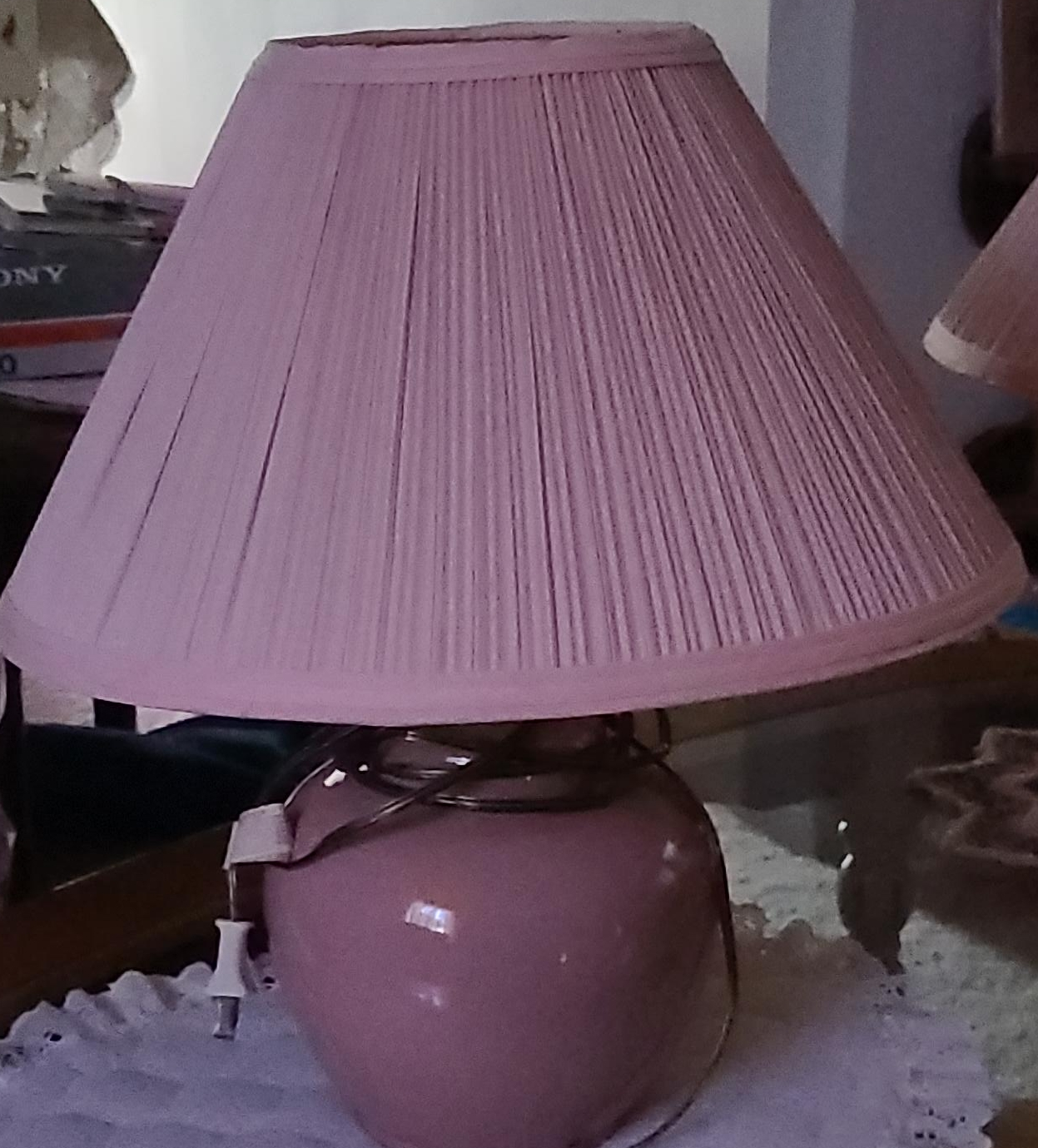 Selling a charming pink ceramic table lamp! It comes with a matching pink shade. It's in good condition and would be a lovely addition to any room