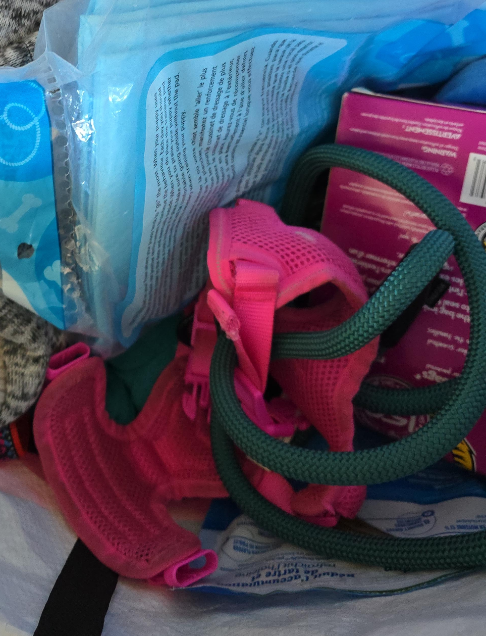 Selling a pink dog harness and a green leash. They're in great shape and ready for a new furry friend! size small