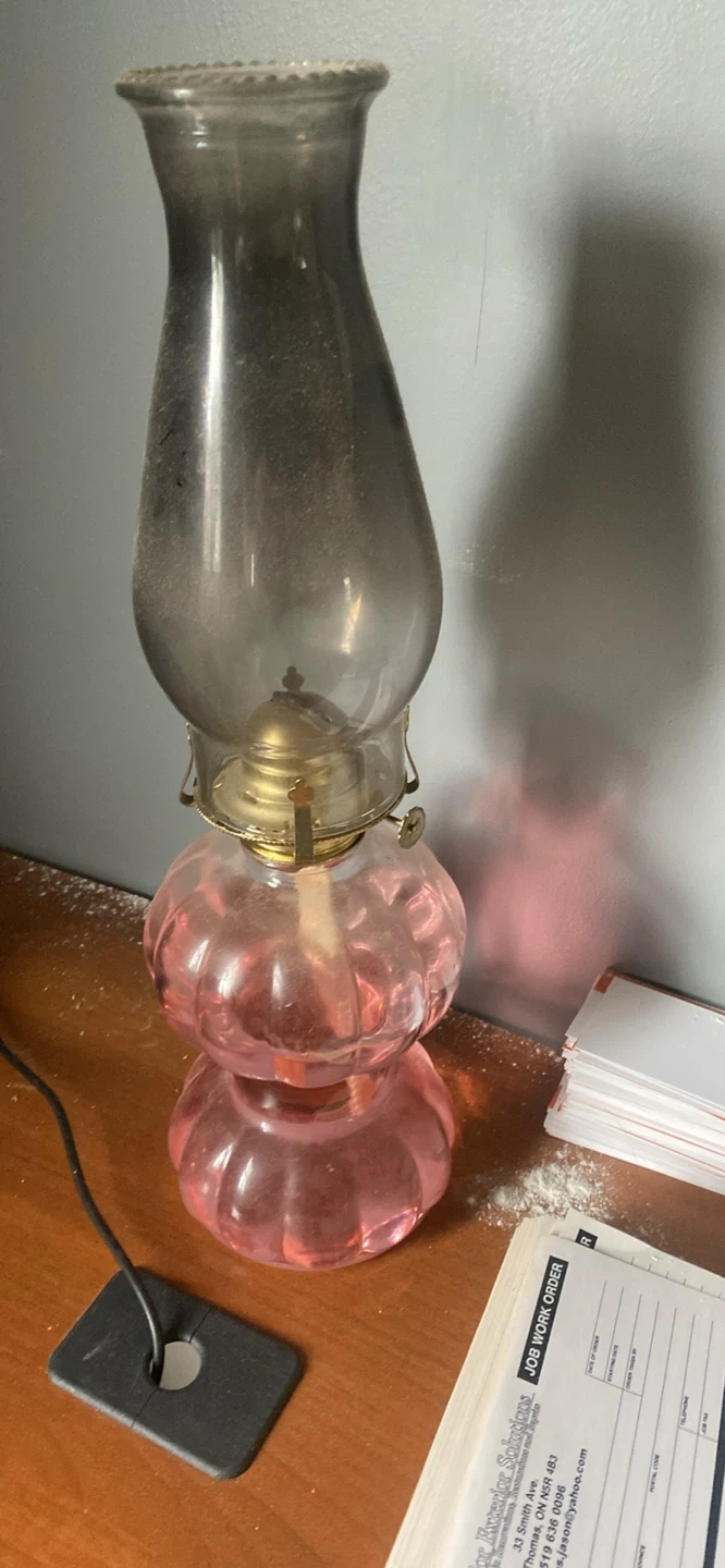 A charming pink glass oil lamp, perfect for adding a touch of vintage elegance to your home. It features a classic design with a glass chimney and a decorative pink base. This lamp would make a lovely accent piece for any room.