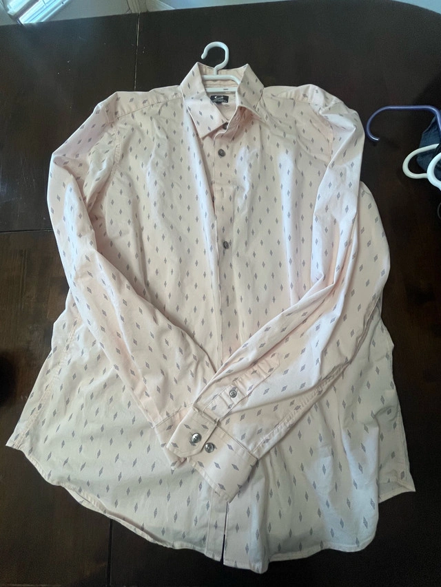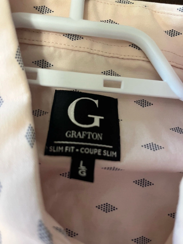 This is a Grafton slim fit dress shirt in size large. It is in very good condition and ready for a new home. Here are some details about the shirt: * Brand: Grafton * Size: Large * Fit: Slim Fit * Colour: Light Pink with dark blue micro diamonds If the ad is up, the shirt is available. It's just waiting to be part of your stylish story! Please check out my other ads