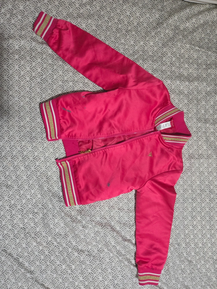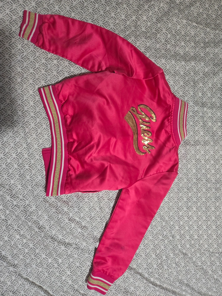 Free! A cute pink Guess Kids bomber jacket size 6! It has gold detailing on the cuffs and collar, and the Guess logo is embroidered on the back. Some paint spot but perfect for layering in style!
