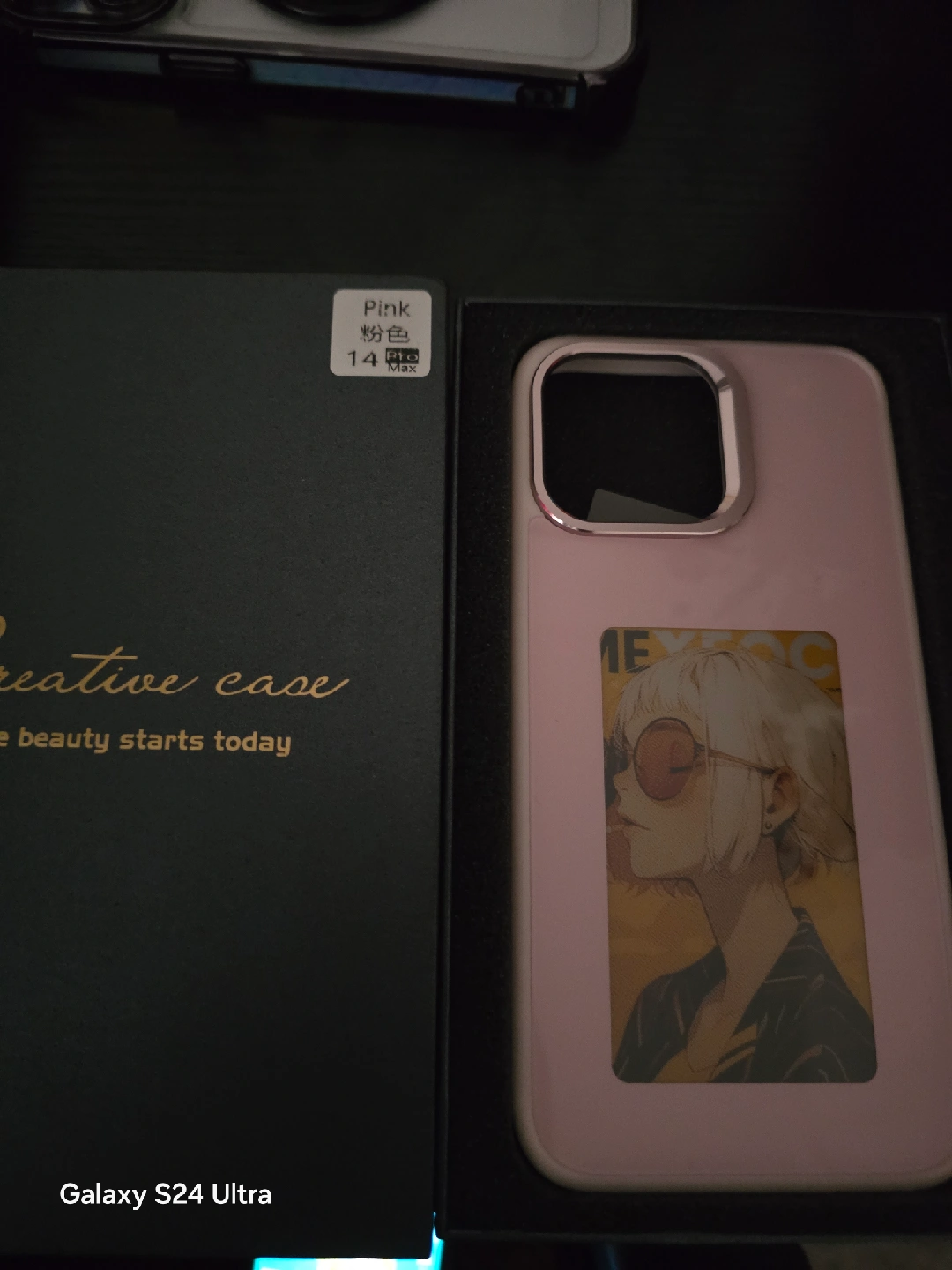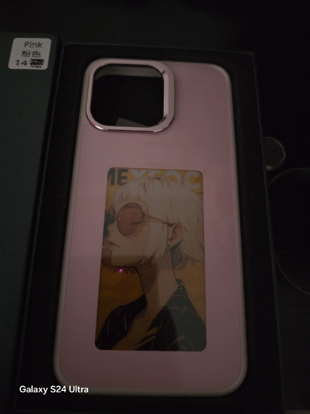 Selling a pink iPhone 14 Pro Max case. It comes with the box. The case has a graphic design on the back features an NFC screen to change the design to your photo or drawing.