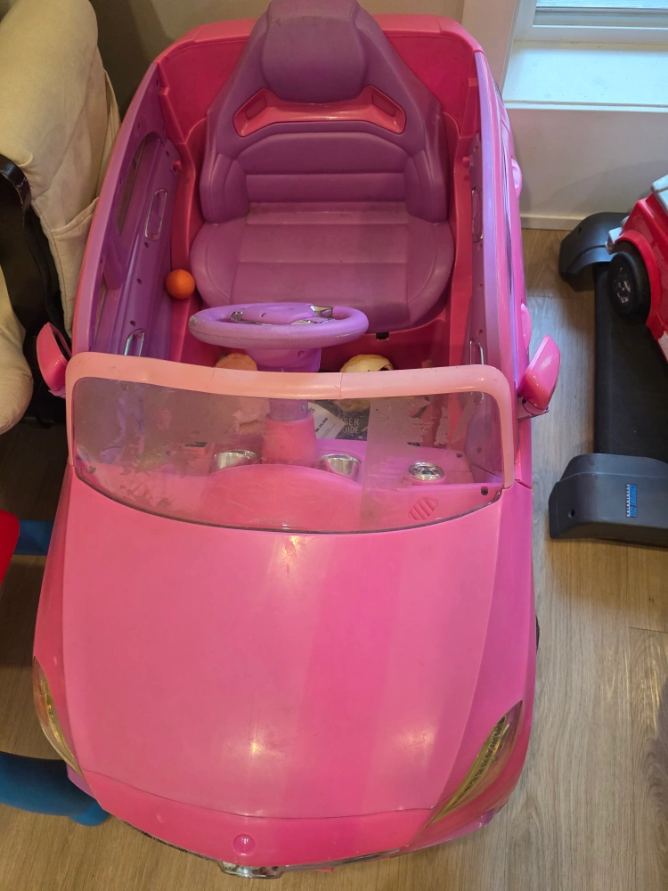 Selling a pink Mercedes Benz ride-on car for kids! It's in used condition, as you can see in the photos. Perfect for little ones who love to cruise around.