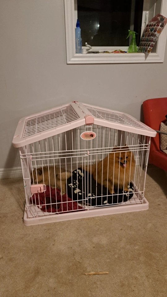 free a super cute pink pet cage! It's in a modern house shape, perfect for small dogs or cats. It's in great condition and ready for a new furry friend