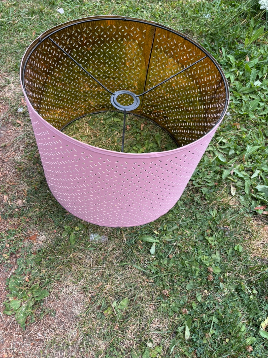 Selling a pink lampshade with a cute patterned design. It's in great shape and would add a nice touch to any room! The inner part is gold coloured.