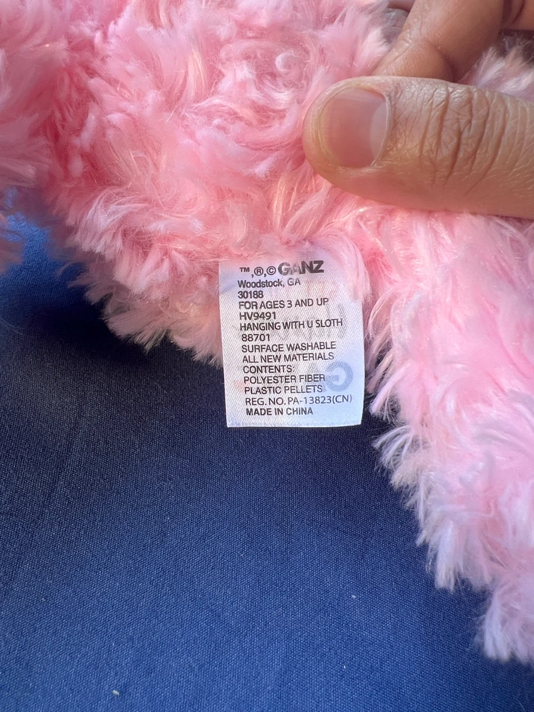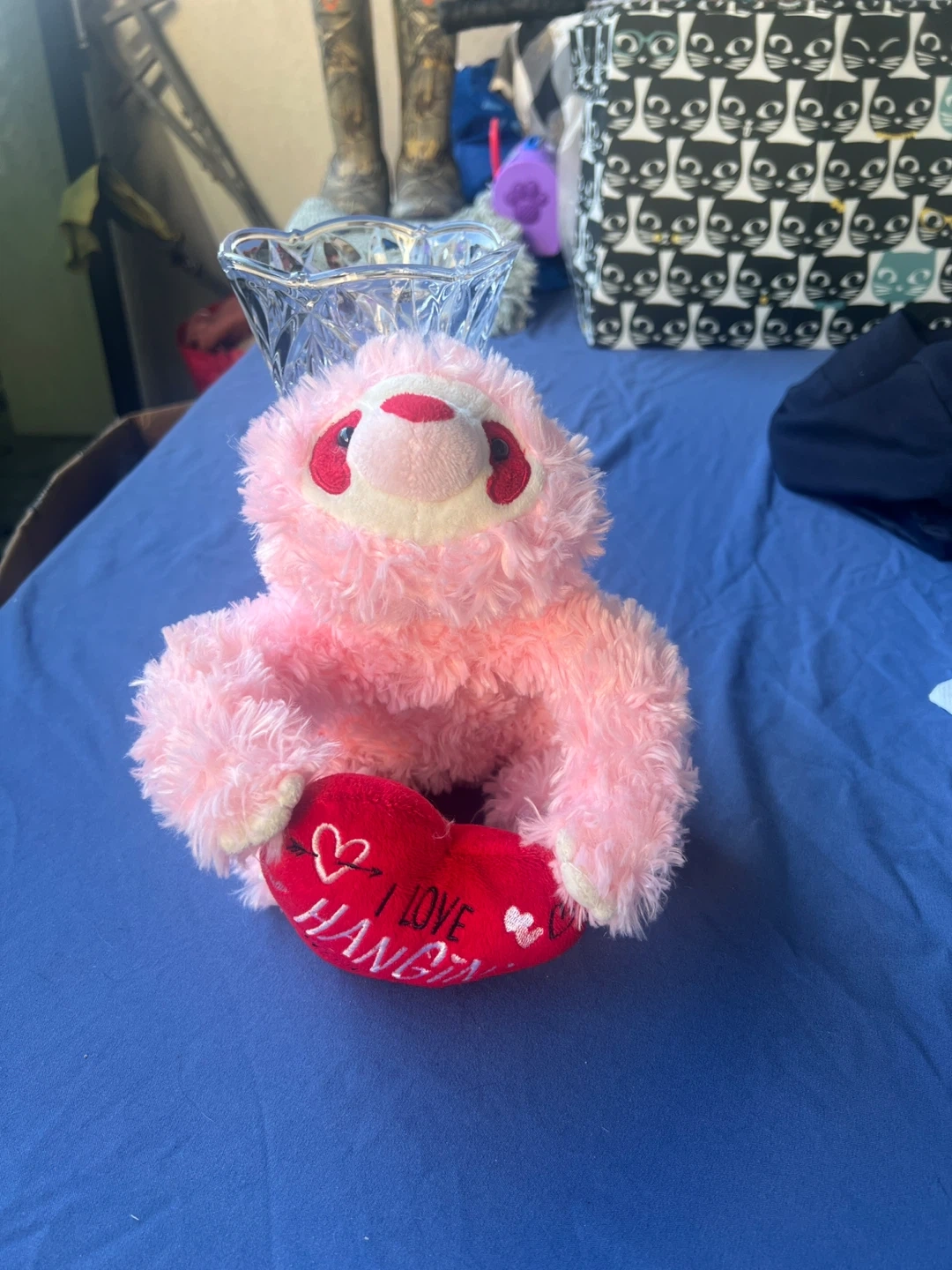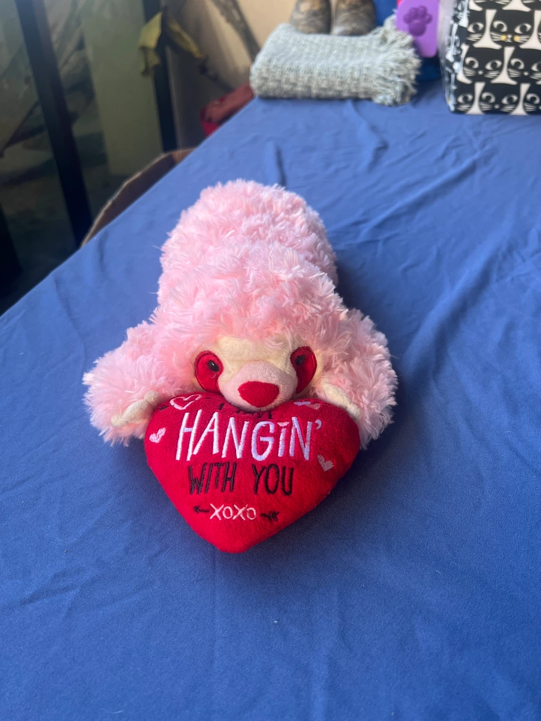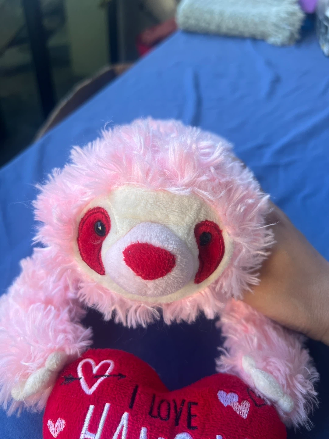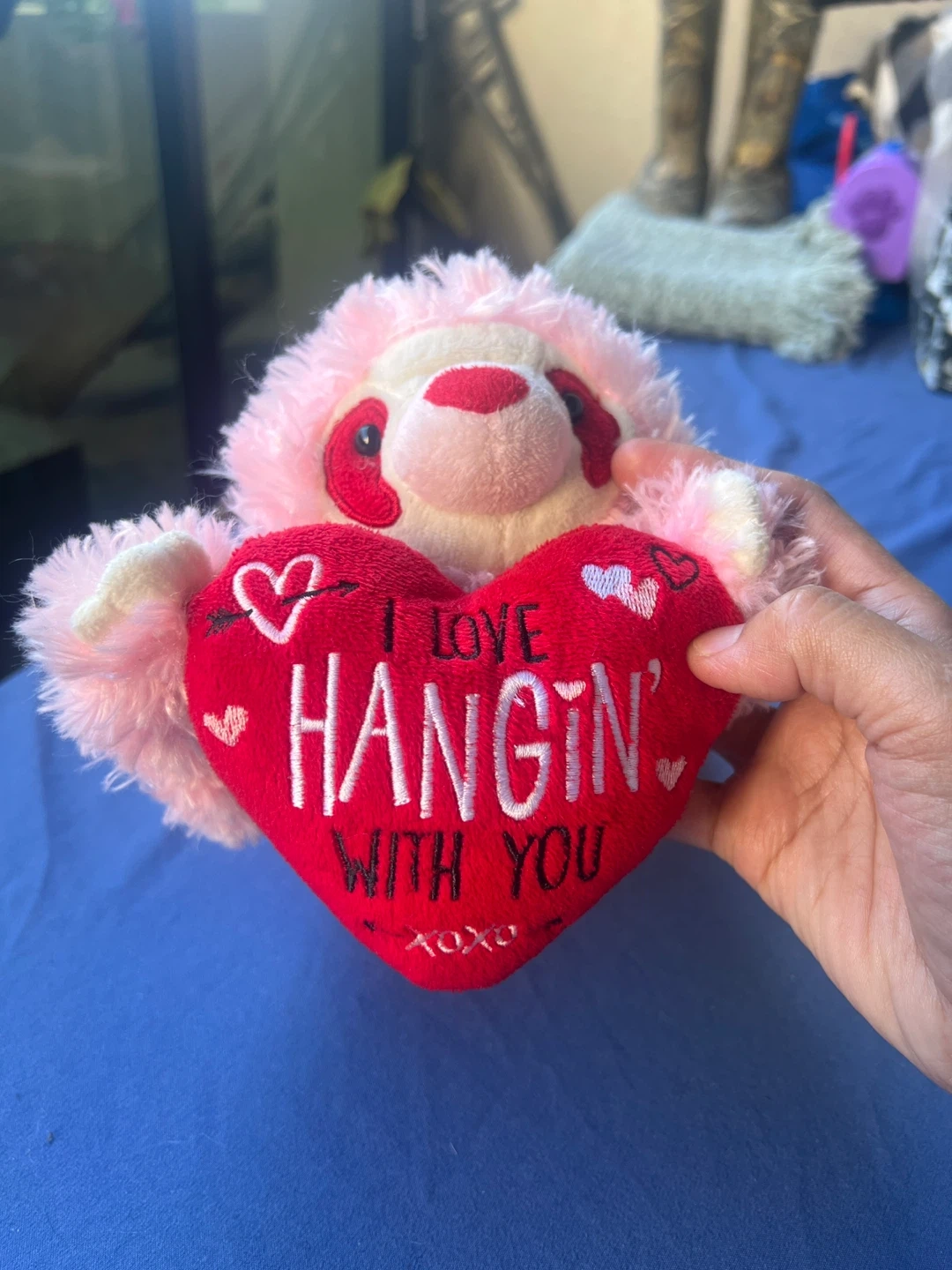 Selling a super cute pink sloth plushie! It's holding a little red heart that says 'Hangin' With You'. Perfect for a Valentine's Day gift or just to add some cuteness to your room