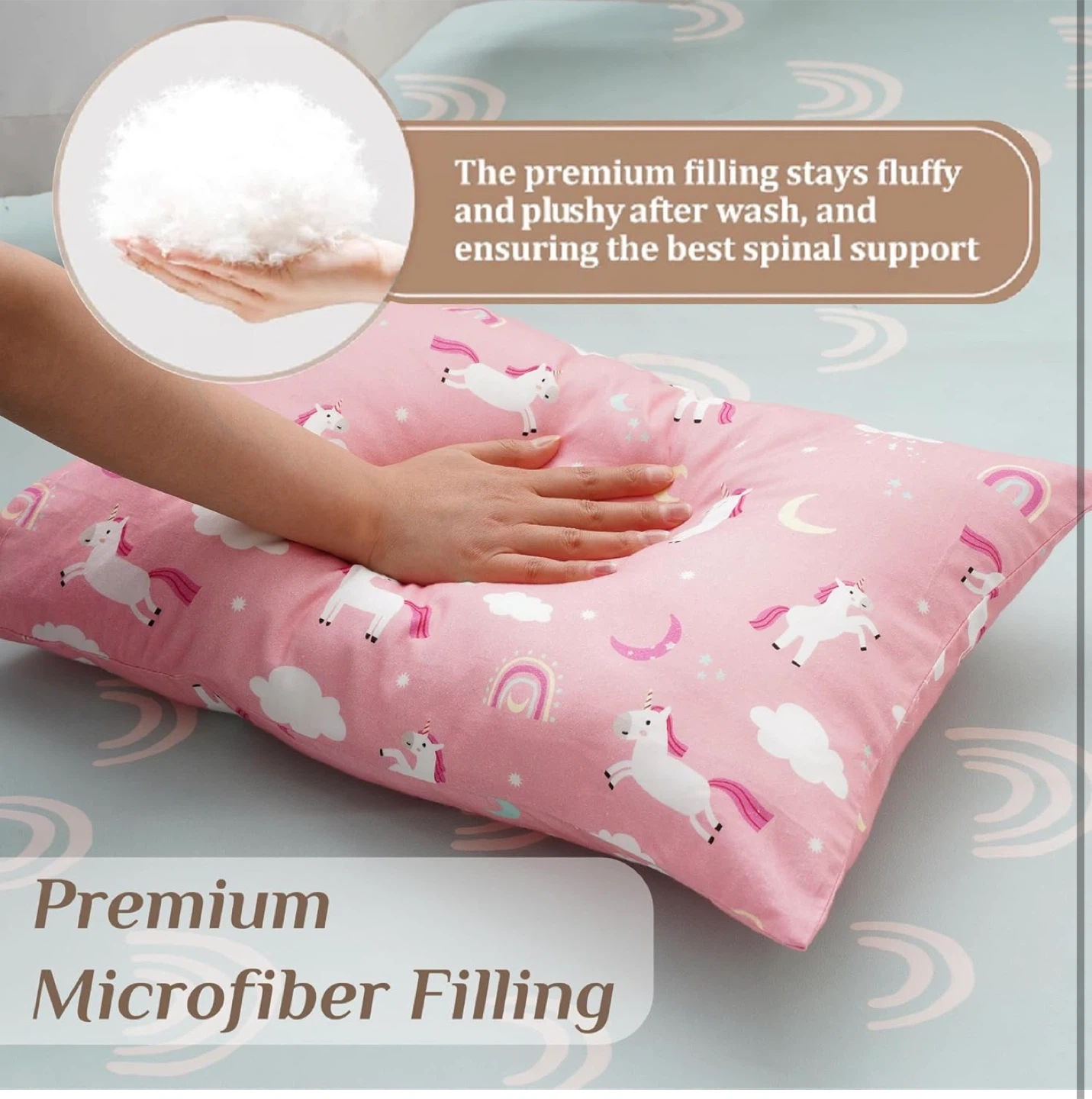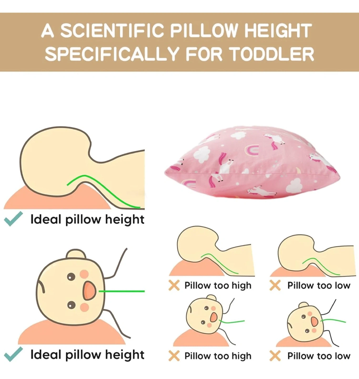 This adorable pink pillow is made with 100% cotton and has a cute unicorn pattern. It's designed with a scientific pillow height specifically for toddlers, ensuring ideal spinal support. The premium microfiber filling stays fluffy and plushy, even after washing! It also features an envelope closure design for easy use