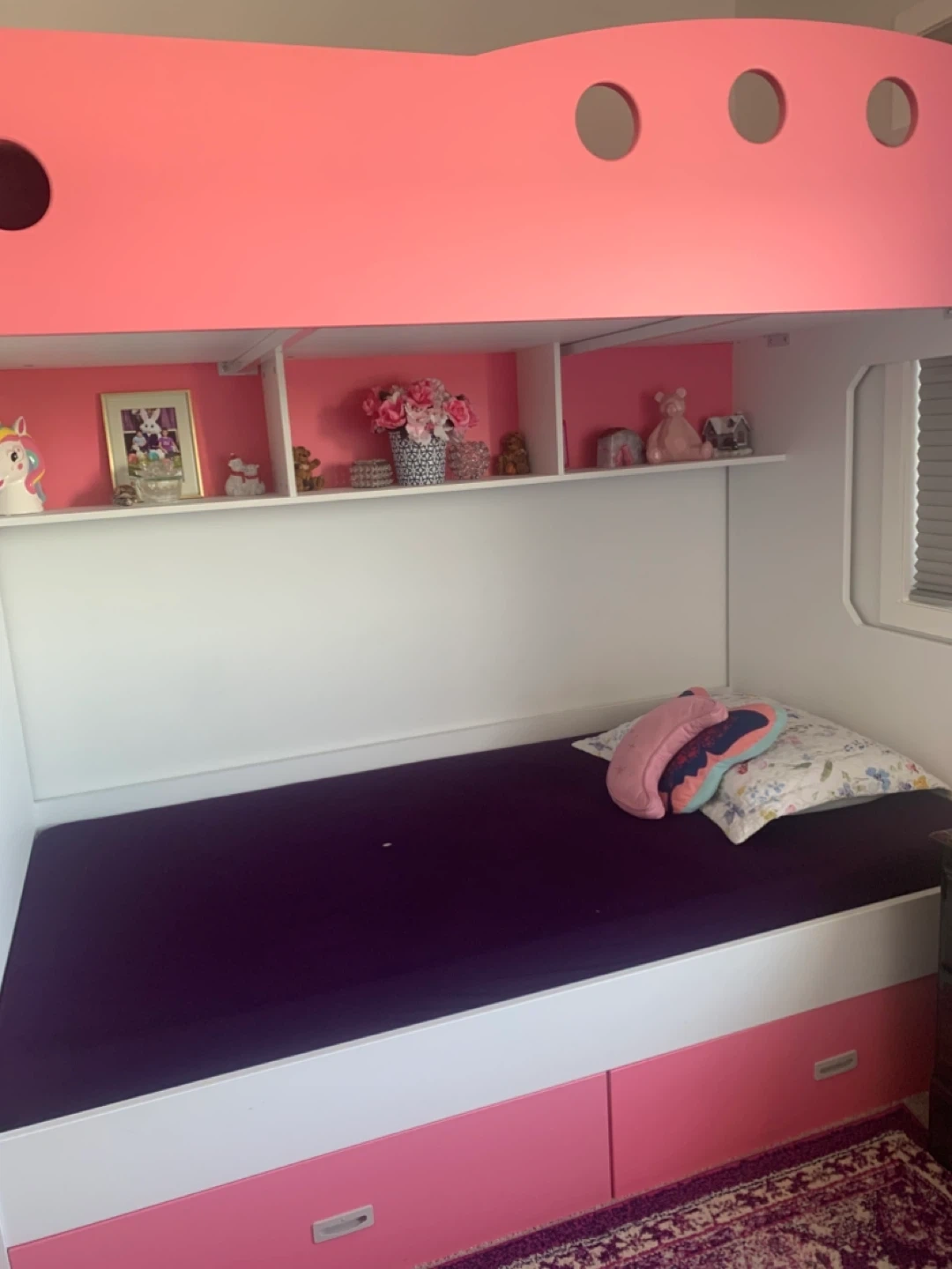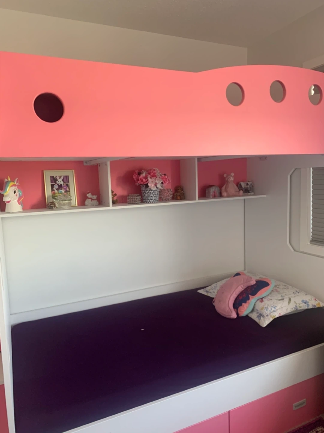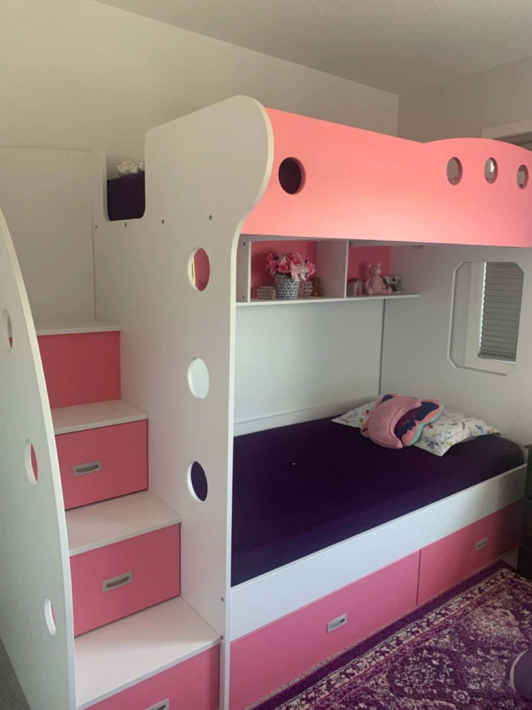 This is a very reliable twin over twin bunk bed perfect for girls. This bunk bed has a separate ladder for easy access to top bed and also has storage drawers. Mattress are also included in price.