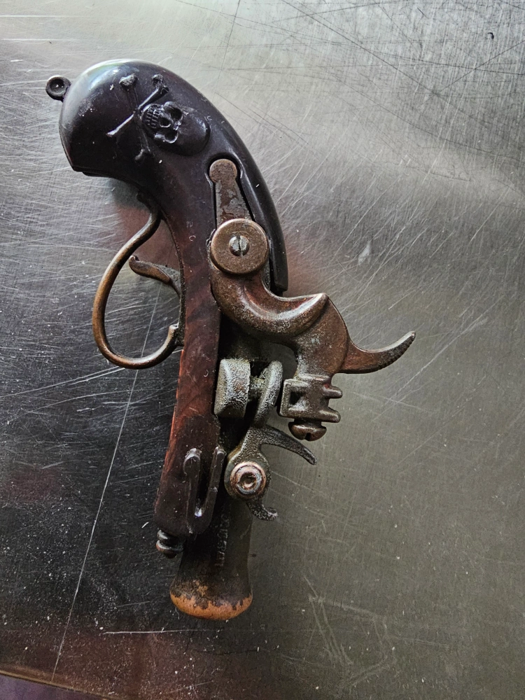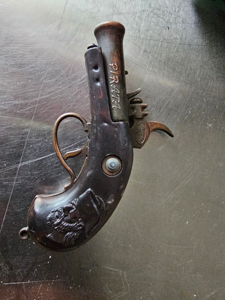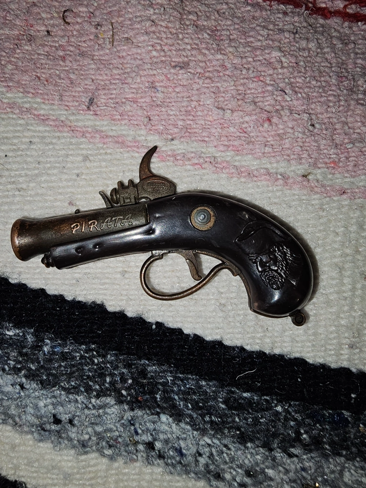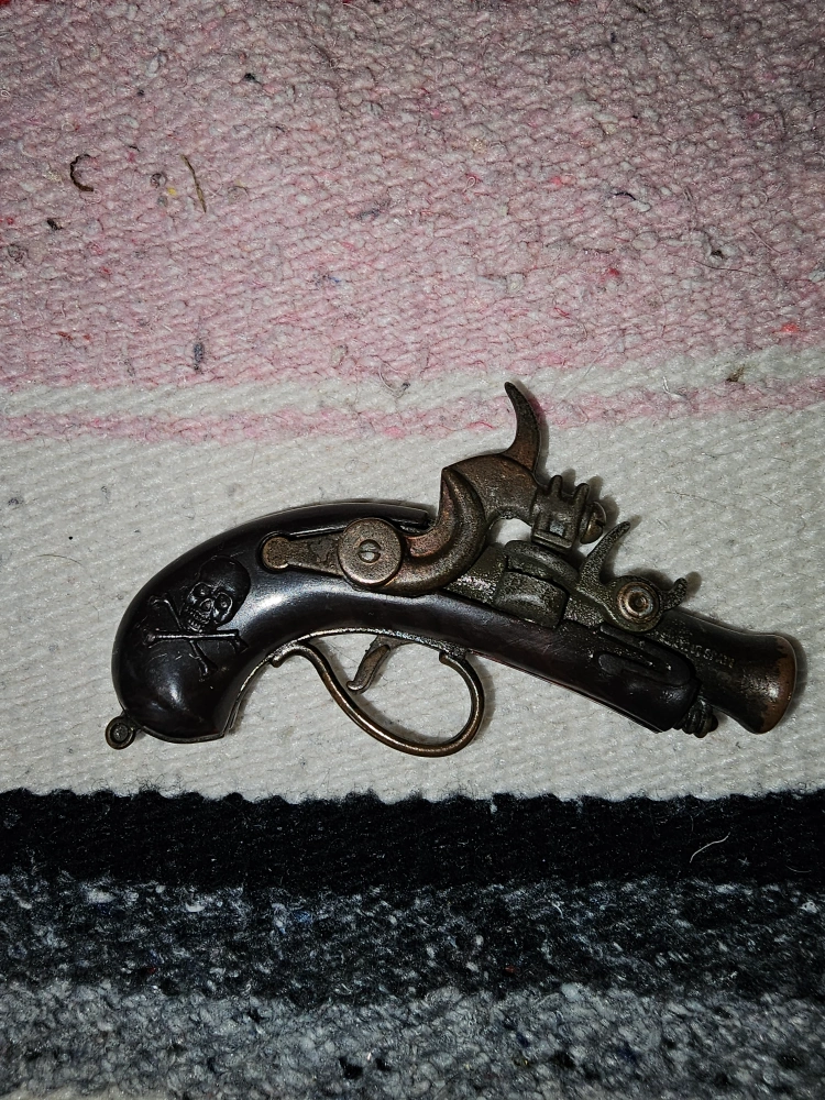 Selling a Pirata replica flintlock pistol. It has a skull and crossbones design on the handle and other decorative engravings. Rare Collectible!
