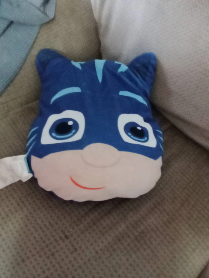 Featuring a cartoon character face. Constructed of blue, white, and light beige fabric. A great companion for a child, providing comfort at bedtime.