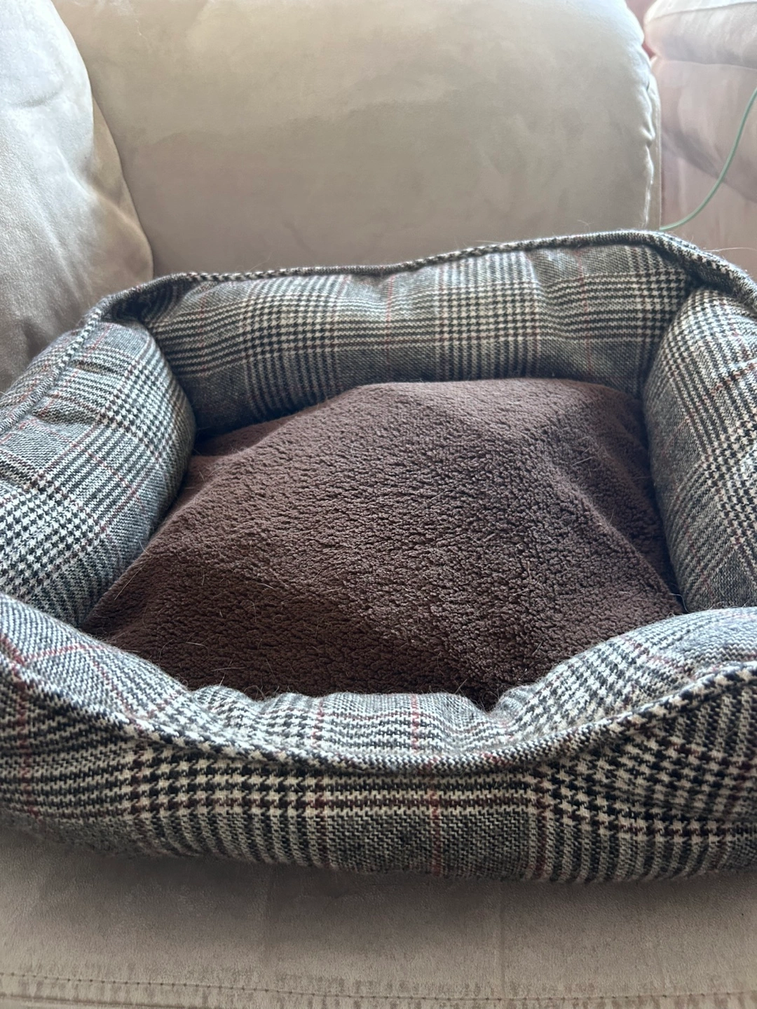 Selling a gently used pet bed! It features a cozy brown cushion and a stylish plaid outer lining. Perfect for your furry friend to curl up in for a nap