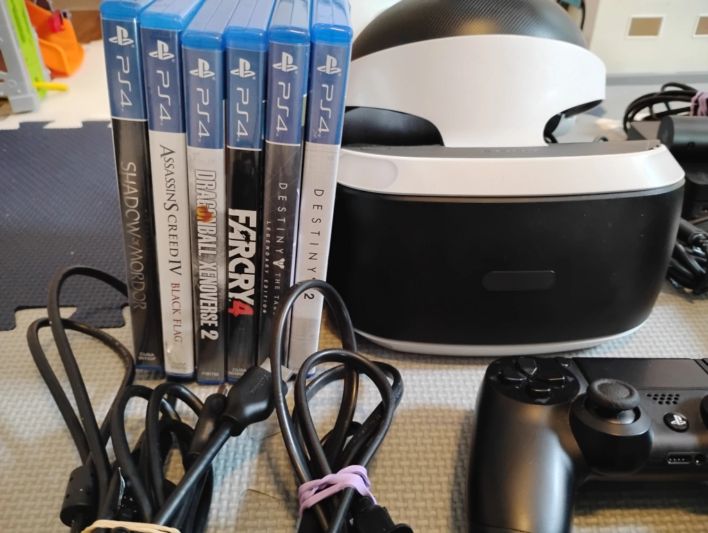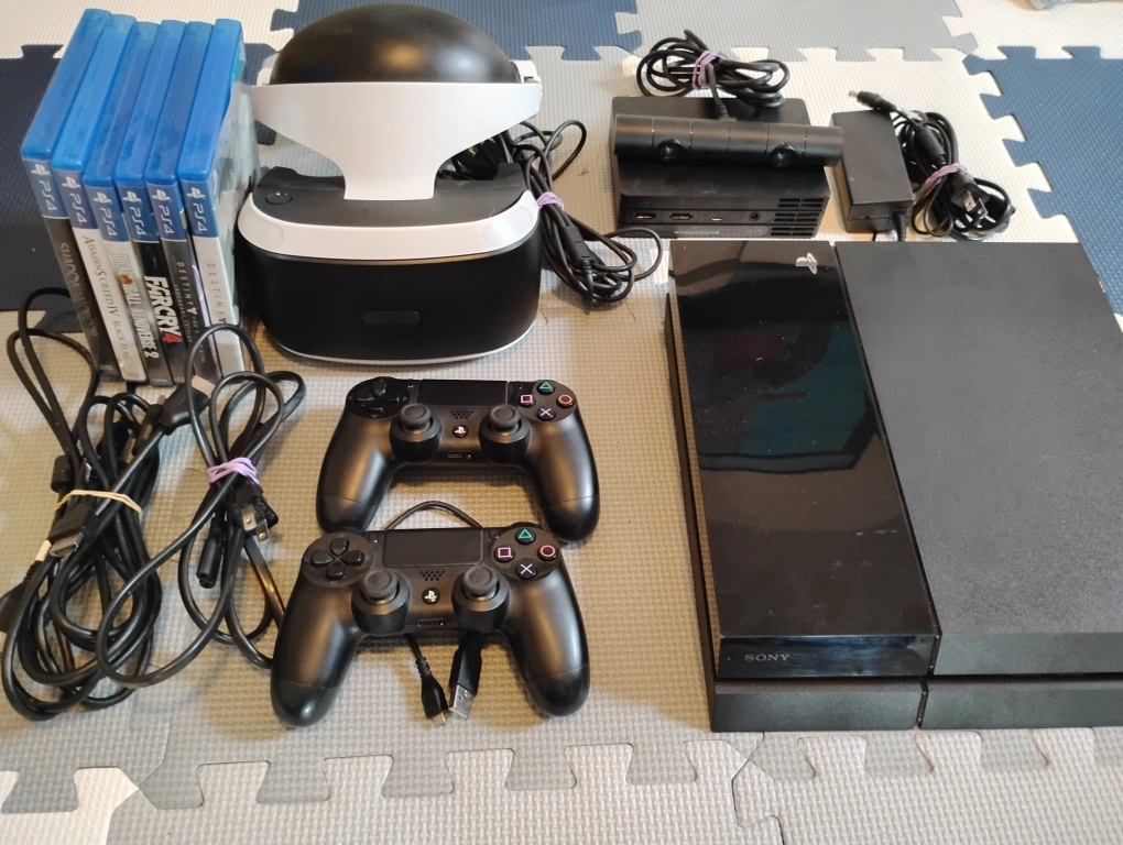 Selling a PlayStation 4 bundle that includes a VR headset and several games! The PS4 is model CUH-1115A. Included are the PS4 console, VR headset, two controllers, and games like Assassin's Creed IV Black Flag, Dragon Ball Xenoverse 2, Far Cry 4, Destiny, and Shadow of Mordor
