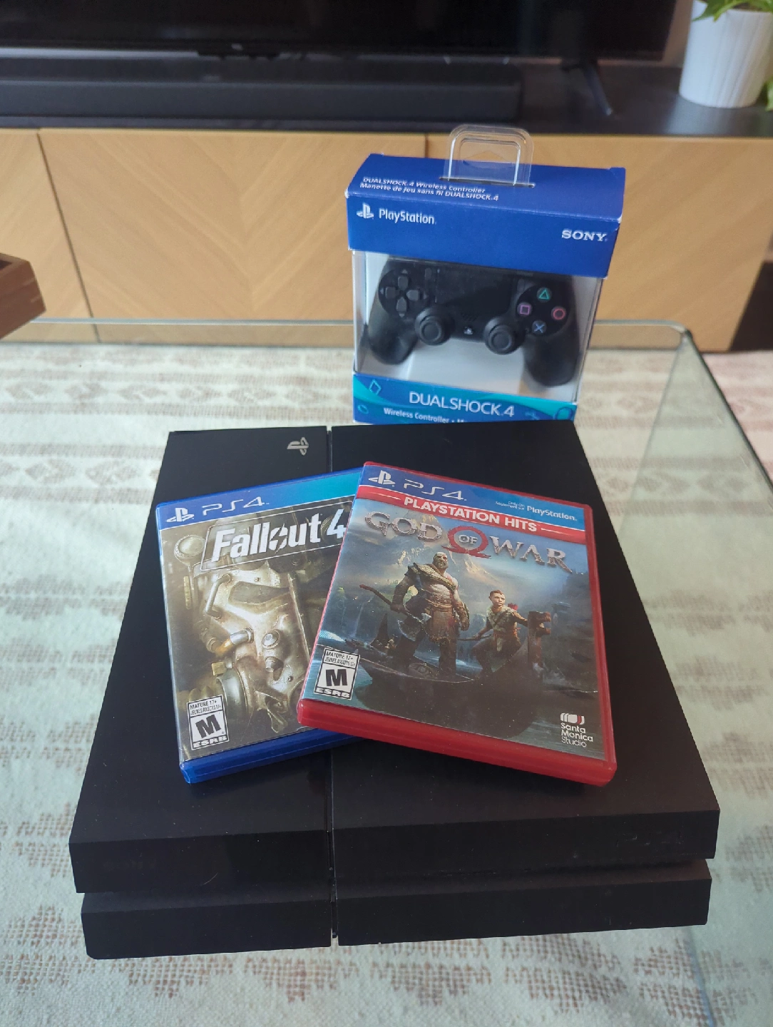 Selling a PlayStation 4 console with a Dualshock 4 wireless controller. Also included are the games Fallout 4 and God of War. Great for some fun gaming!