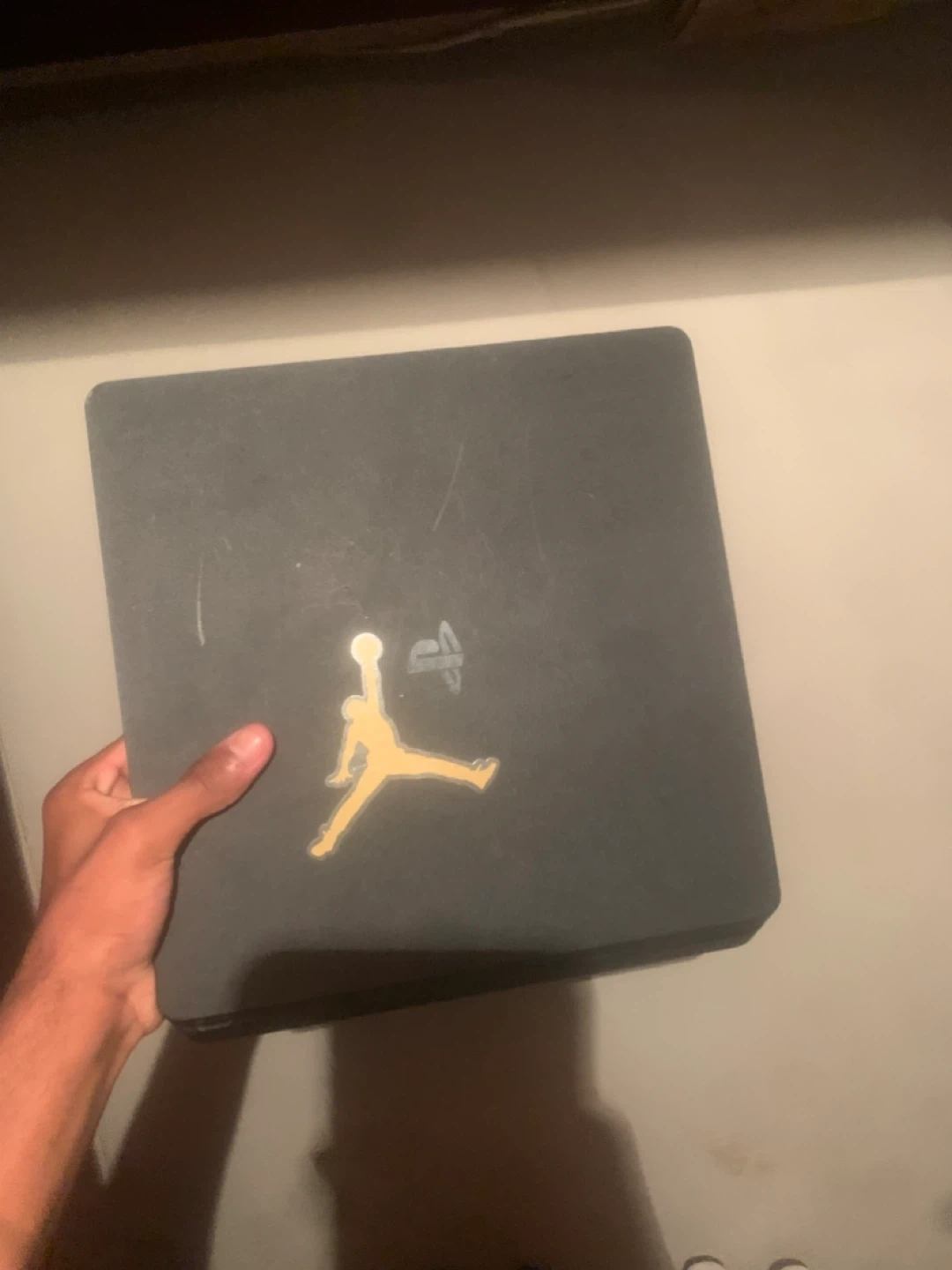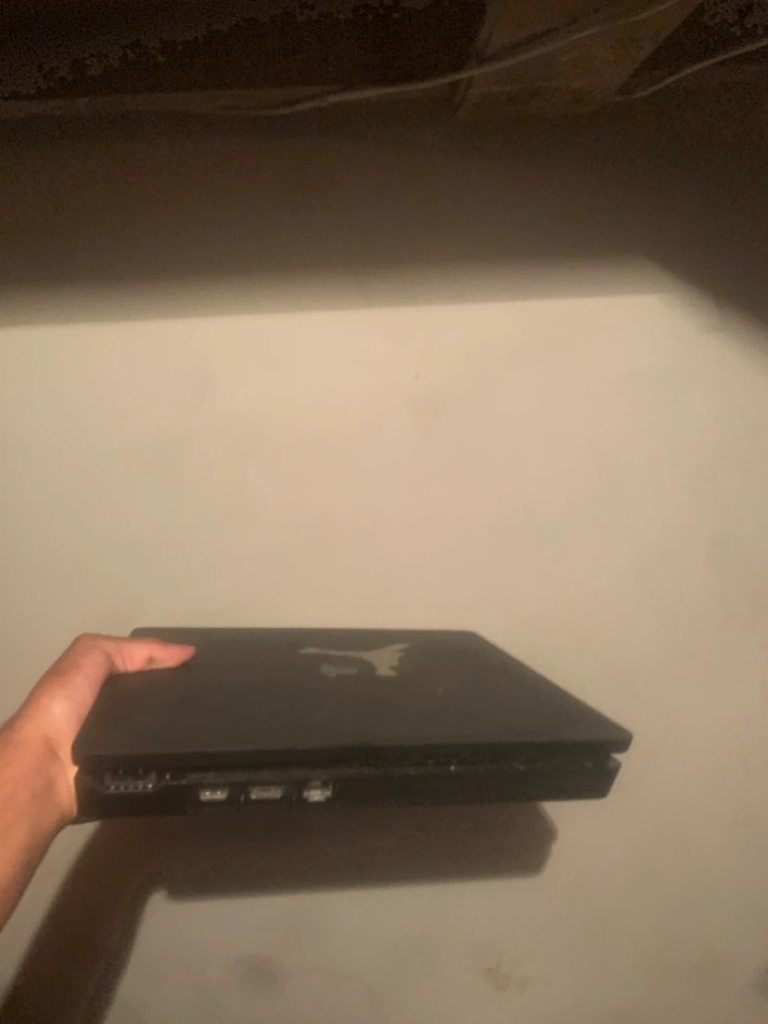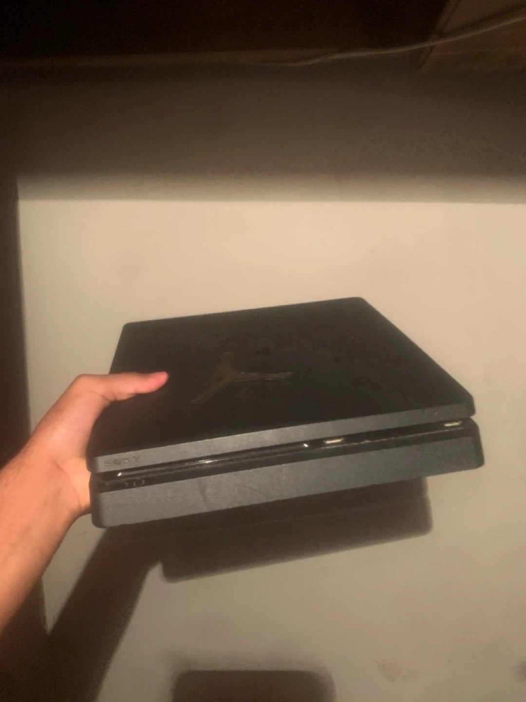 Selling a used PlayStation 4 (PS4) with a custom Jordan logo on top. It shows signs of wear and scratches, but it's still functional. Perfect for someone looking for a unique gaming console!