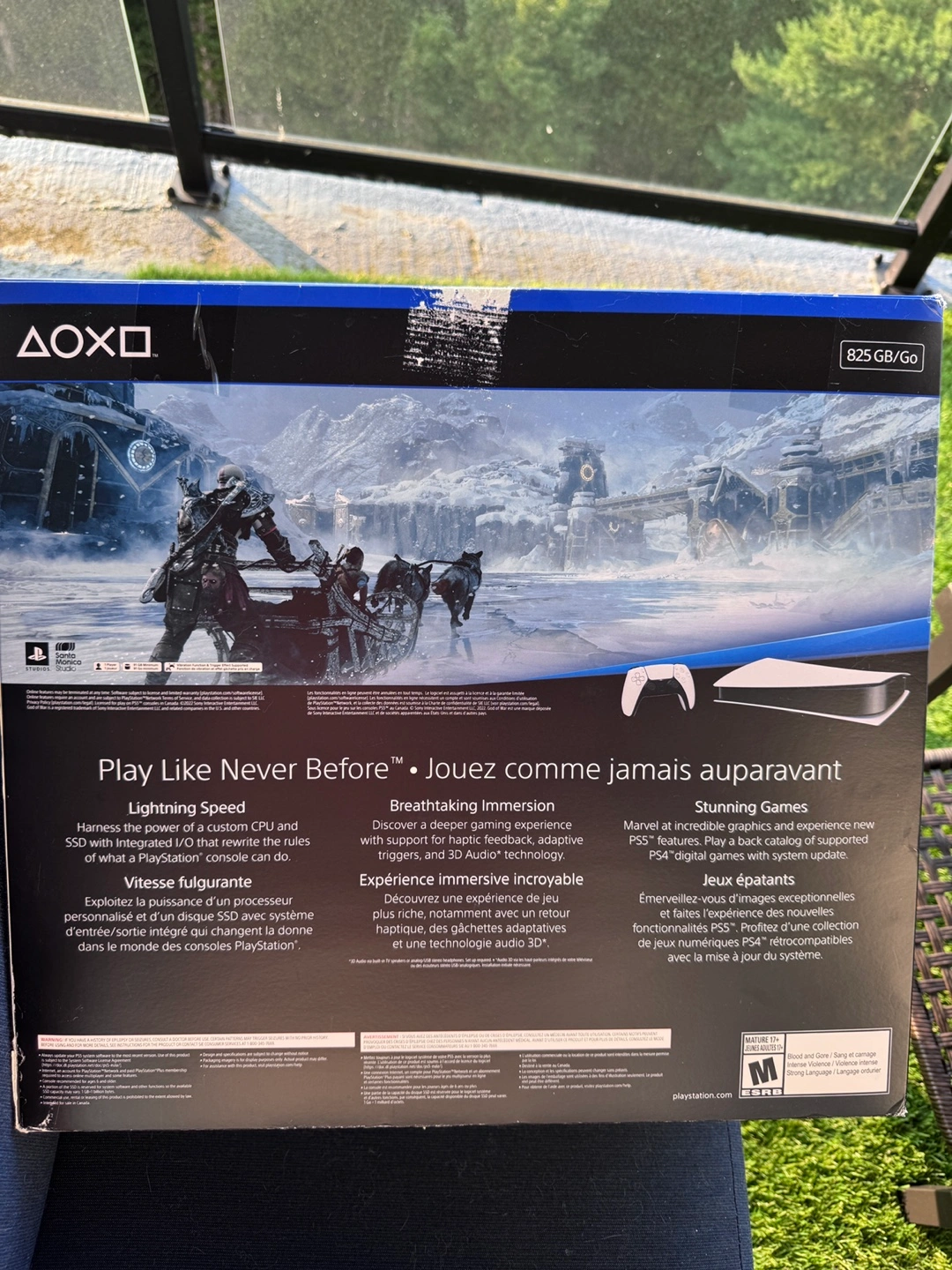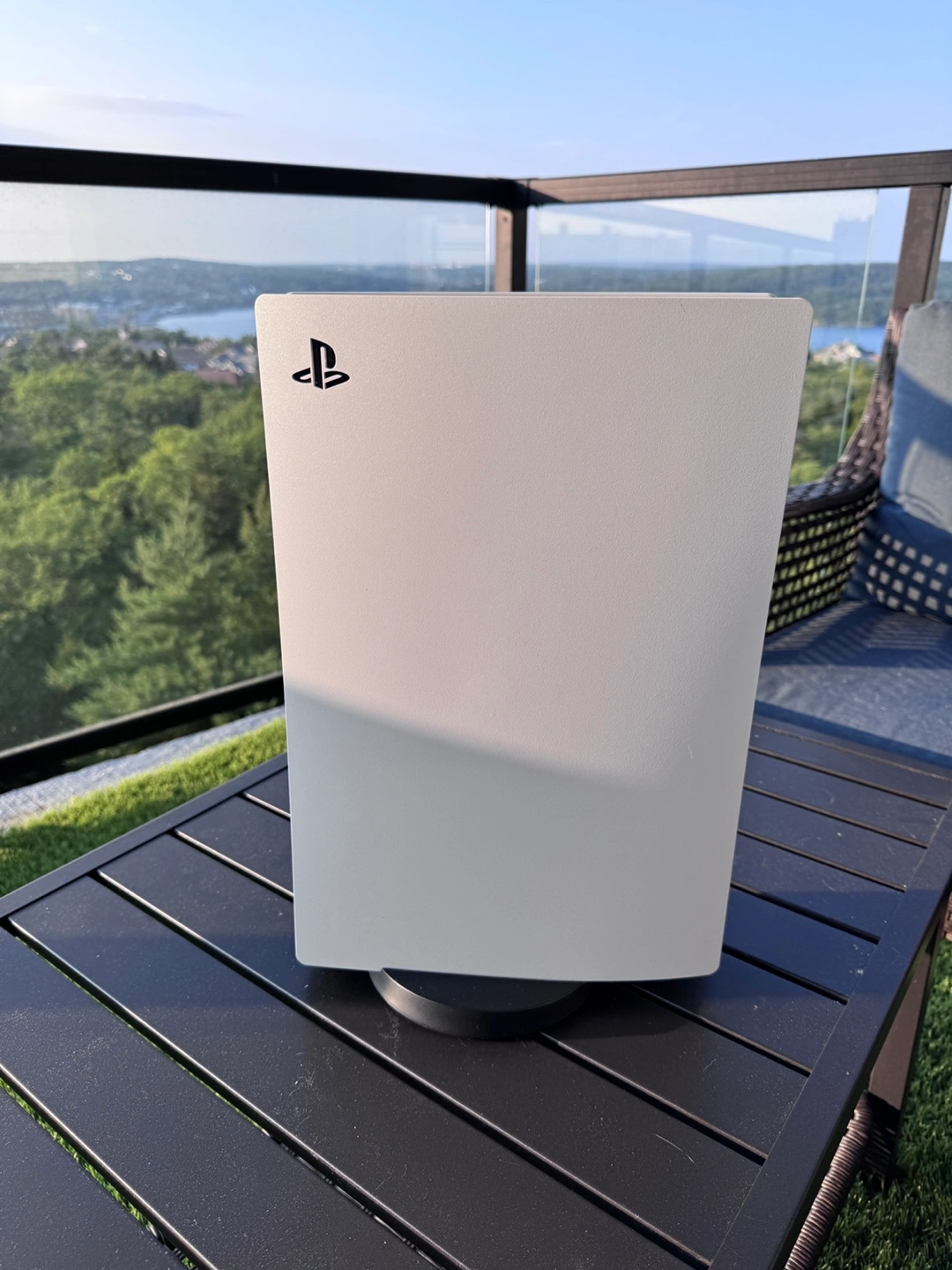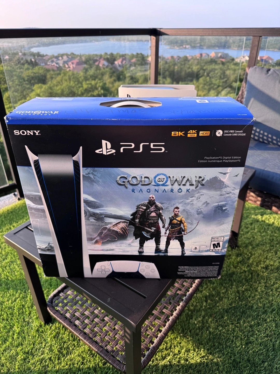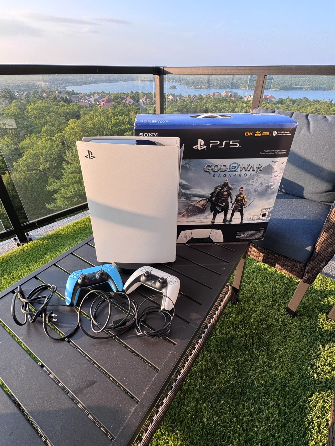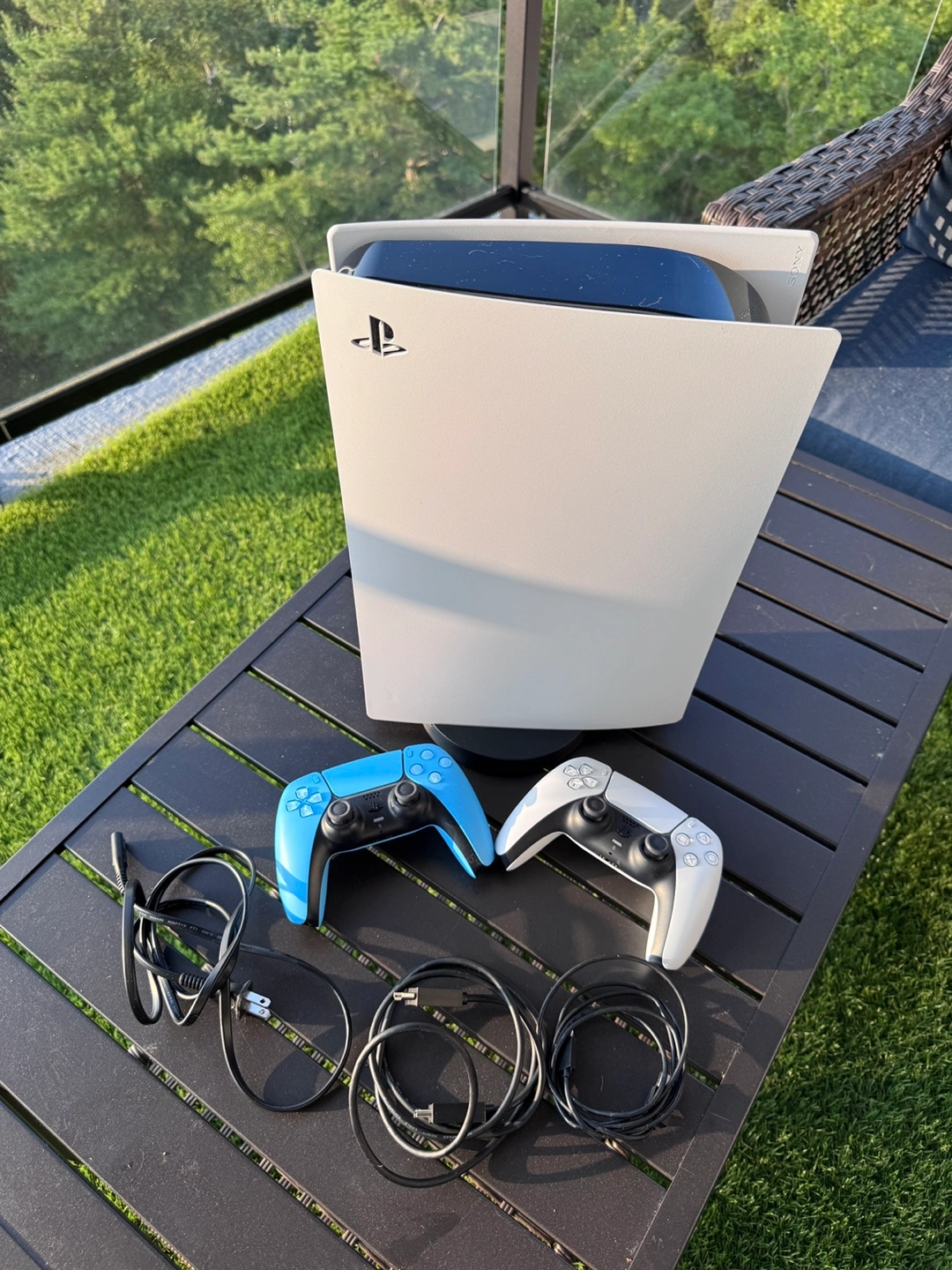Selling a PlayStation 5 Digital Edition. It comes with two controllers, one white and one blue, and all the necessary cables. The box is also included!