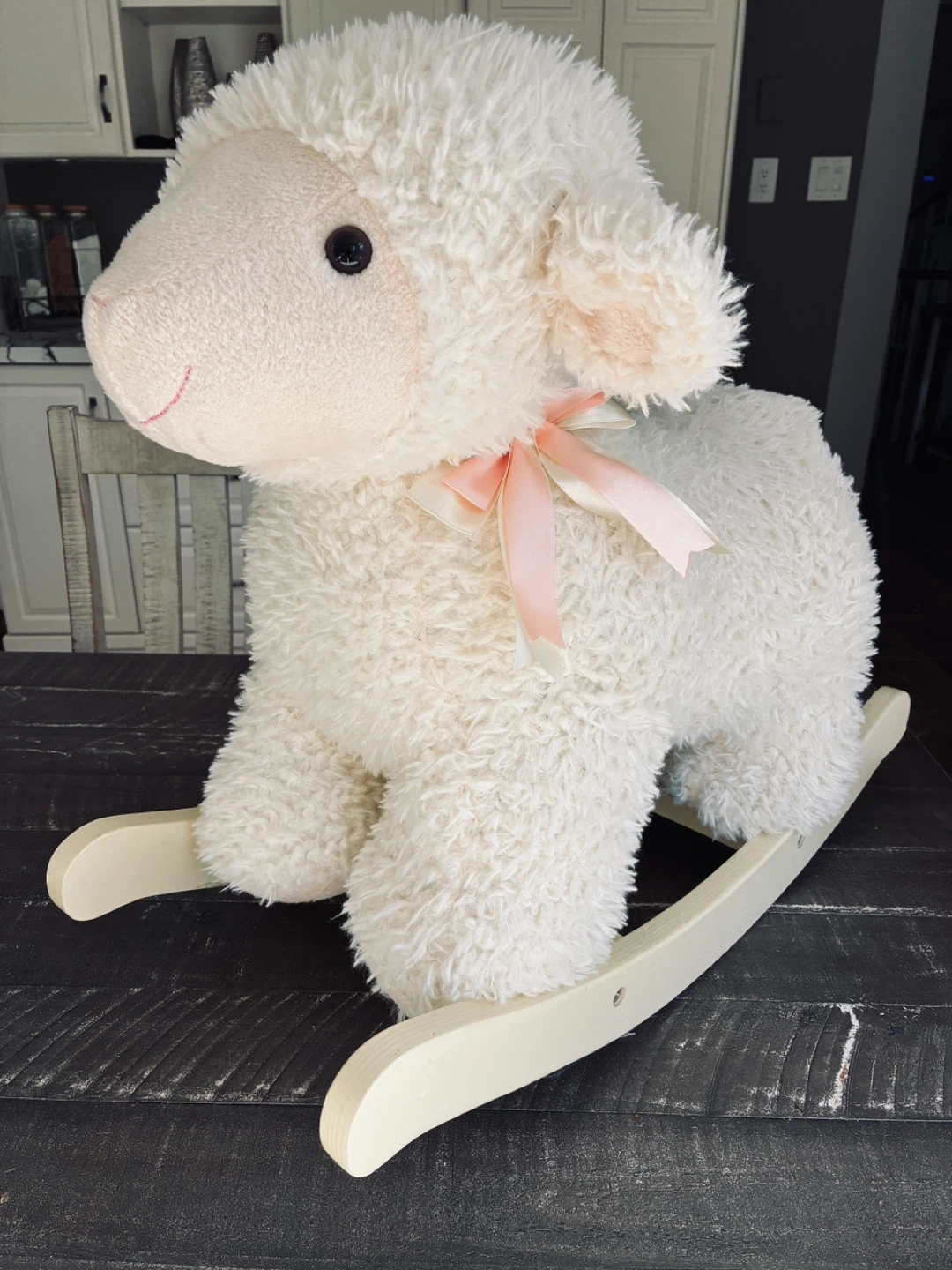 Super cute plush rocking lamb! It's in great condition and would be perfect for a nursery or playroom. It has a soft, fluffy texture and a sweet pink ribbon around its neck