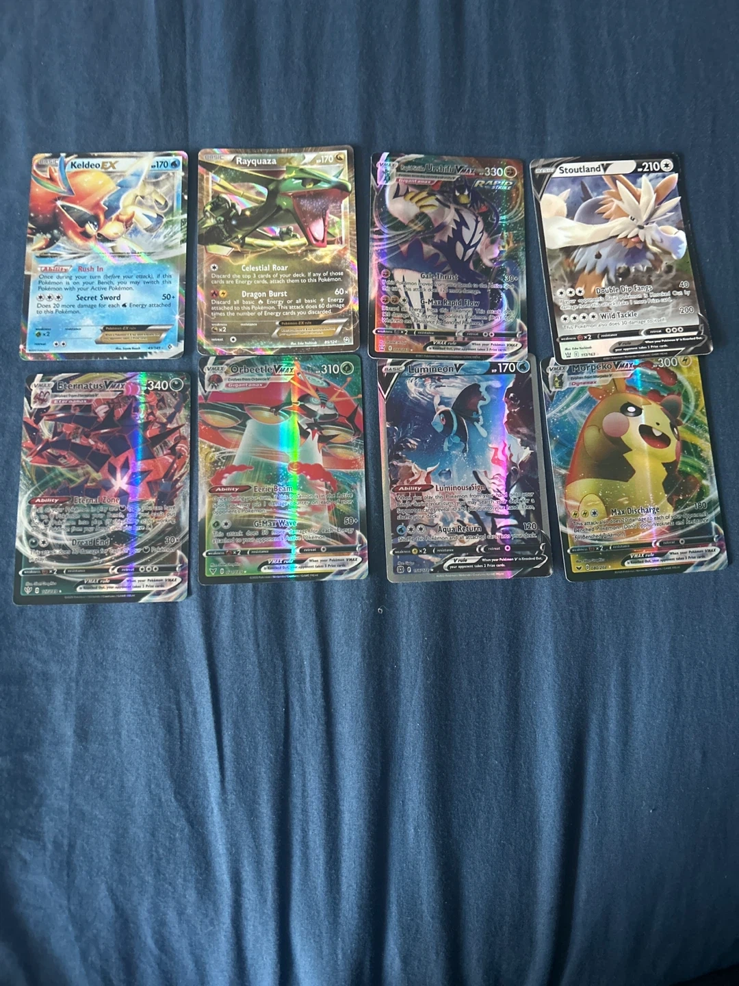Selling a collection of Pokemon cards! Includes Keldeo EX, Rayquaza, Rapid Strike Urshifu VMAX, Stoutland V, Eternatus VMAX, Orbeetle VMAX, Lumineon V, and Morpeko VMAX. Check out the photos for details!