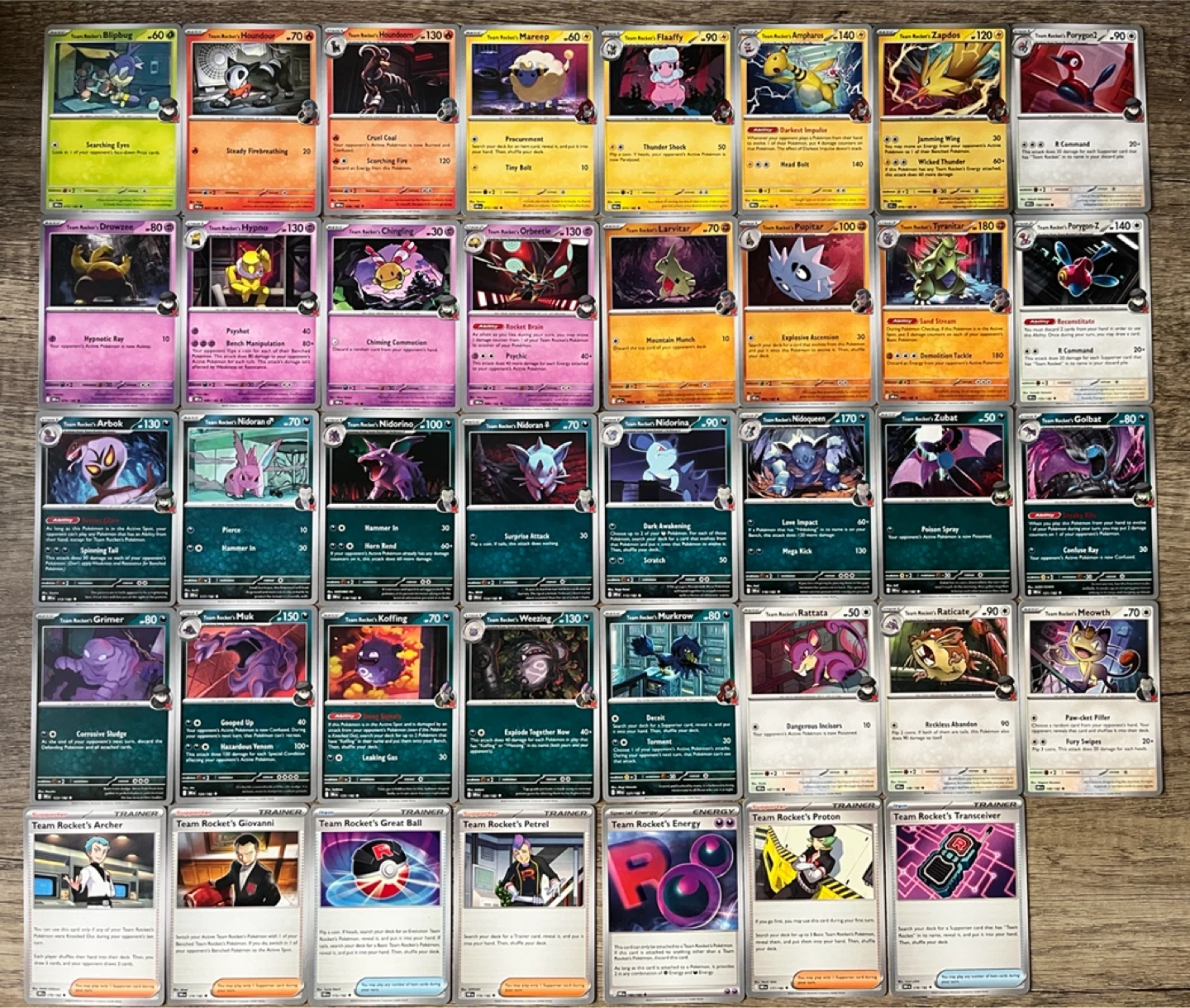 Team Rocket themed Pokemon and trainer cards from the English (Destined Rivals) and Japanese (Glory of Team Rocket) booster sets. Selling as singles or as a whole. Take all cards for $20 or: - $15 for all English cards - $5 for all Japanese cards