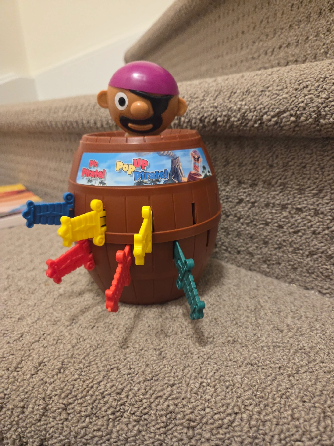 Selling a gently used Pop Up Pirate game! It's a fun and exciting game for kids. Just push the colourful swords into the barrel, but be careful, you never know when the pirate will pop up!
