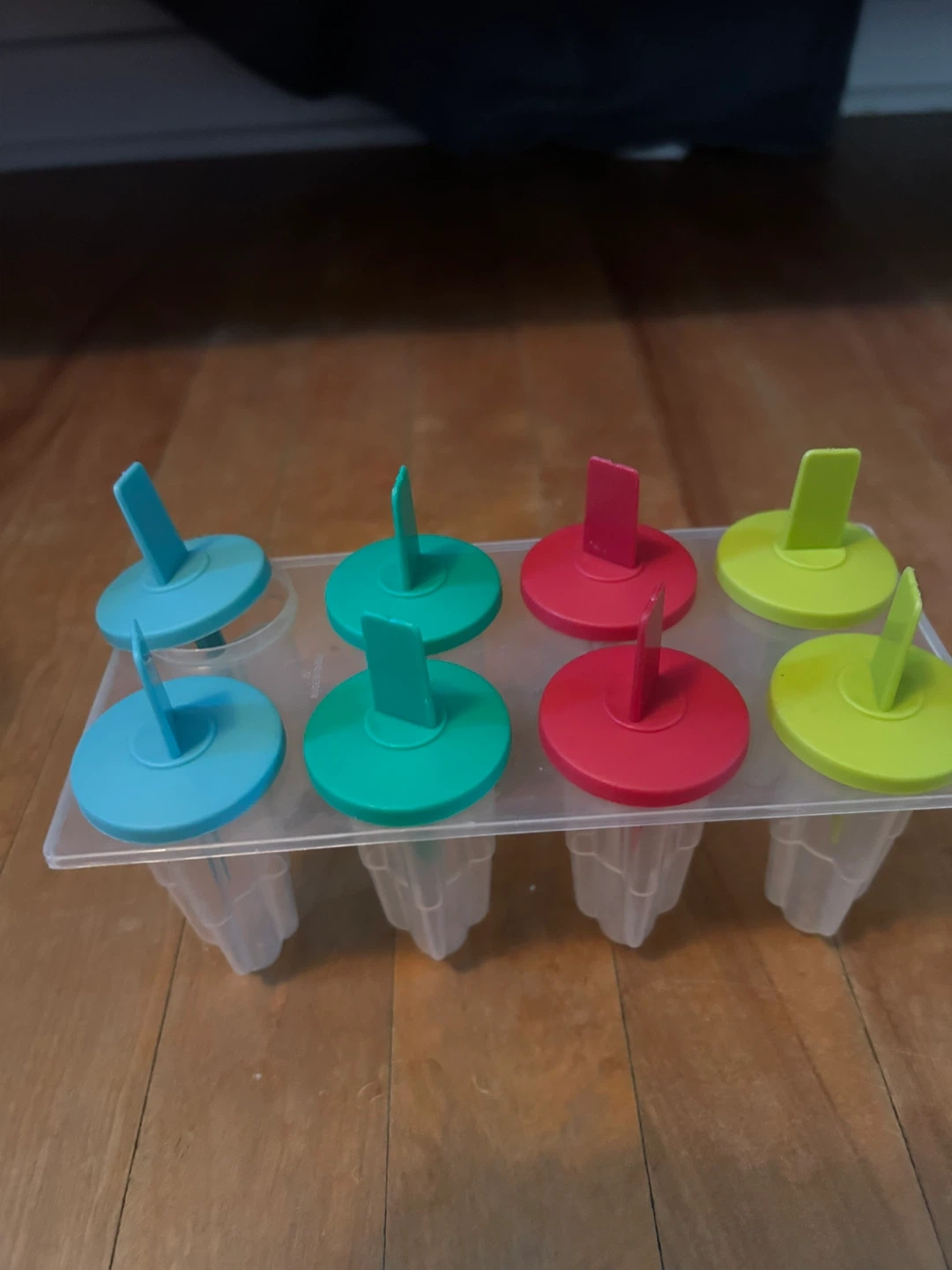I'm selling a popsicle mold with 8 slots! It features a variety of fun colours, including blue, green, red, and yellow. It's perfect for making homemade popsicles for the summer