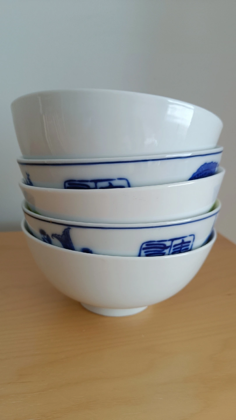 Selling a set of 5 Japanese style rice bowls! They're white with lovely blue fish designs. Perfect for adding a touch of elegance to your dinner table
