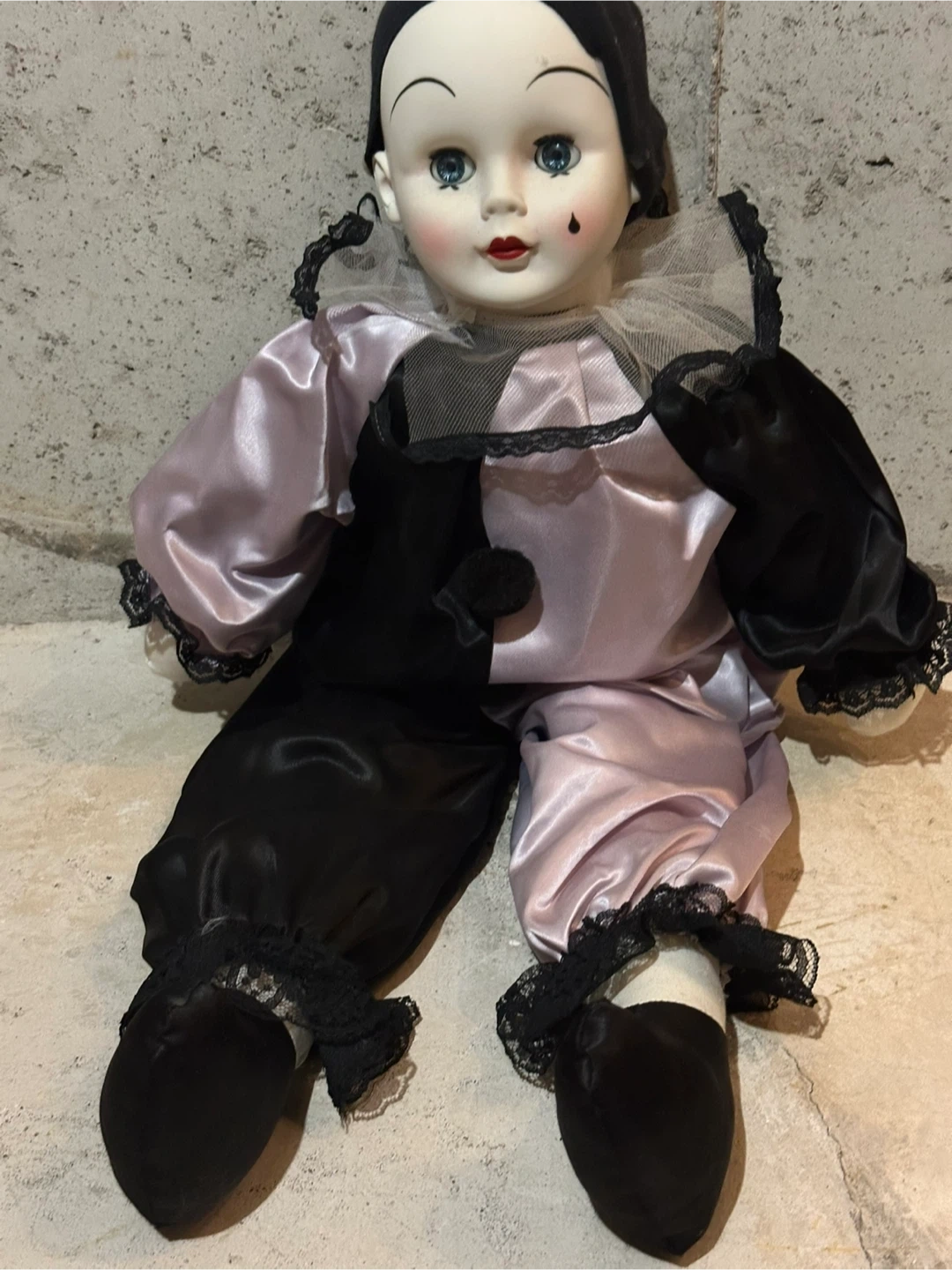 Selling a porcelain clown doll. It has a black and lavender satin outfit with lace trim. It has a tear drop painted under one eye. It's in good condition.