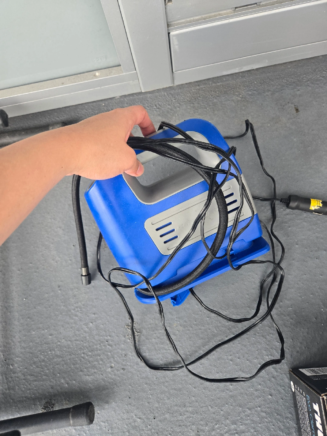 Selling a portable air compressor! It's in great shape and ready to help you inflate tires or other inflatables. It's blue and easy to carry around, perfect for keeping in your car for emergencies