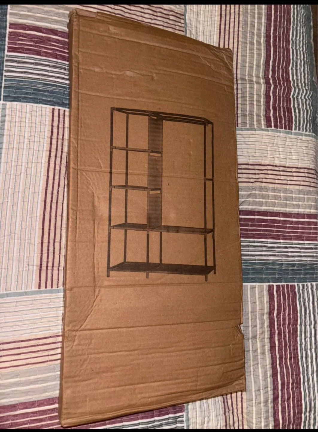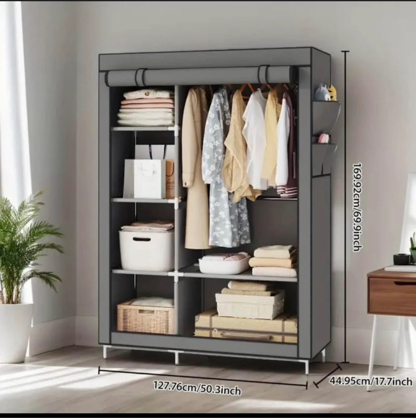 Selling a portable closet wardrobe organizer, perfect for adding extra storage space! It features multiple shelves and a hanging rod to keep your clothes and accessories neatly organized. The dimensions are approximately 169.92cm (69.9 inches) in height and 127.76cm (50.3 inches) in width. The depth is about 44.95cm (17.7 inches). Comes in its original box