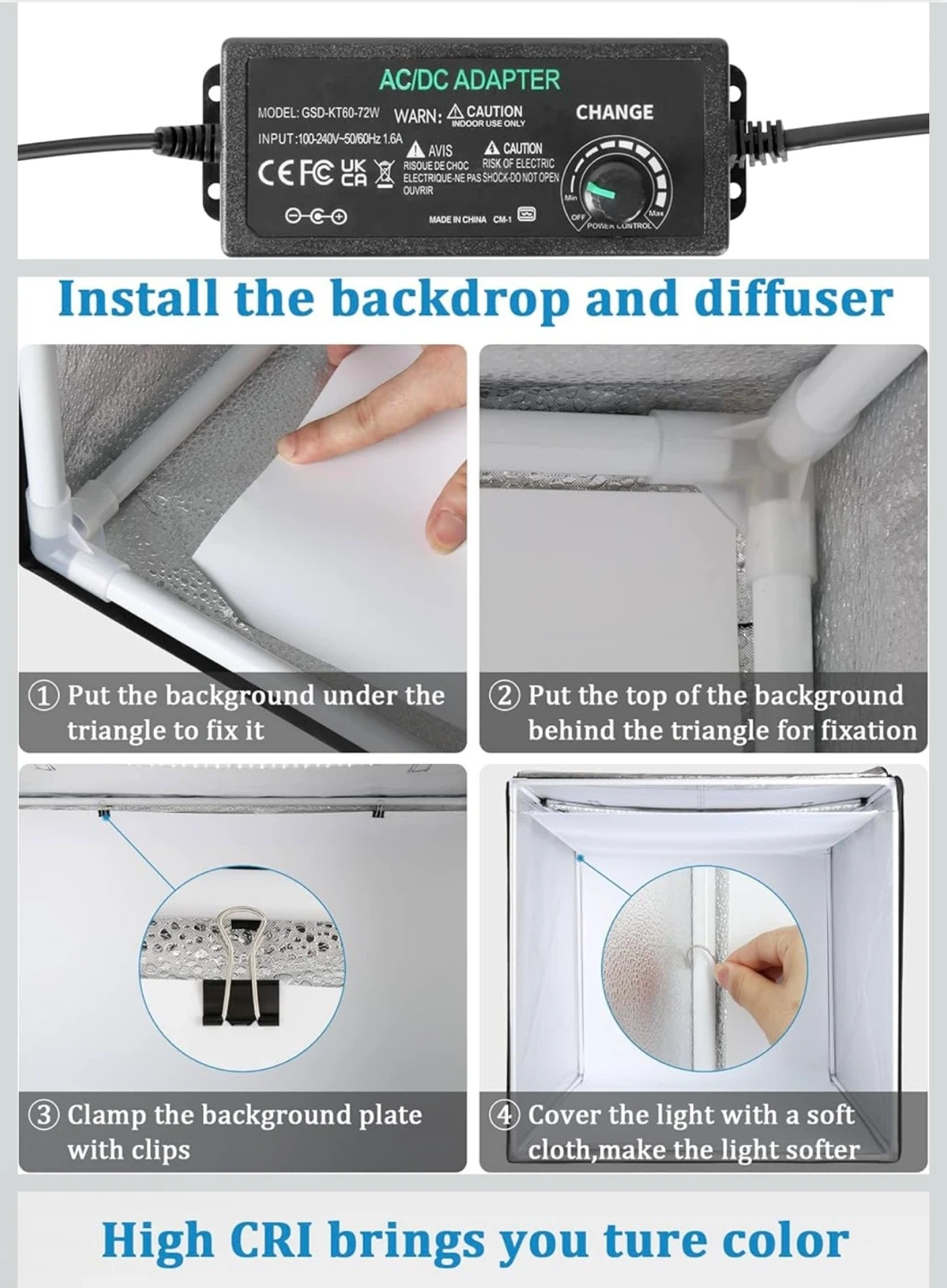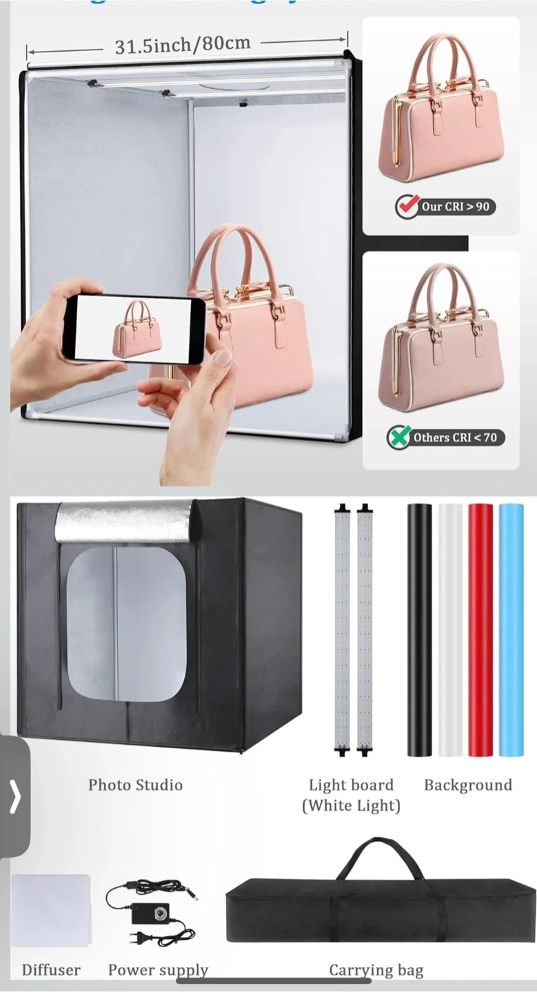 This portable photo studio is perfect for taking professional-looking photos of your products! It measures 31.5 inches and comes with everything you need to get started, including: - Carrying bag - AC/DC adapter - Diffuser - Backgrounds - Light board (white light) The 360° rotatable LED light strips make shooting more flexible, and the high CRI brings you true colour