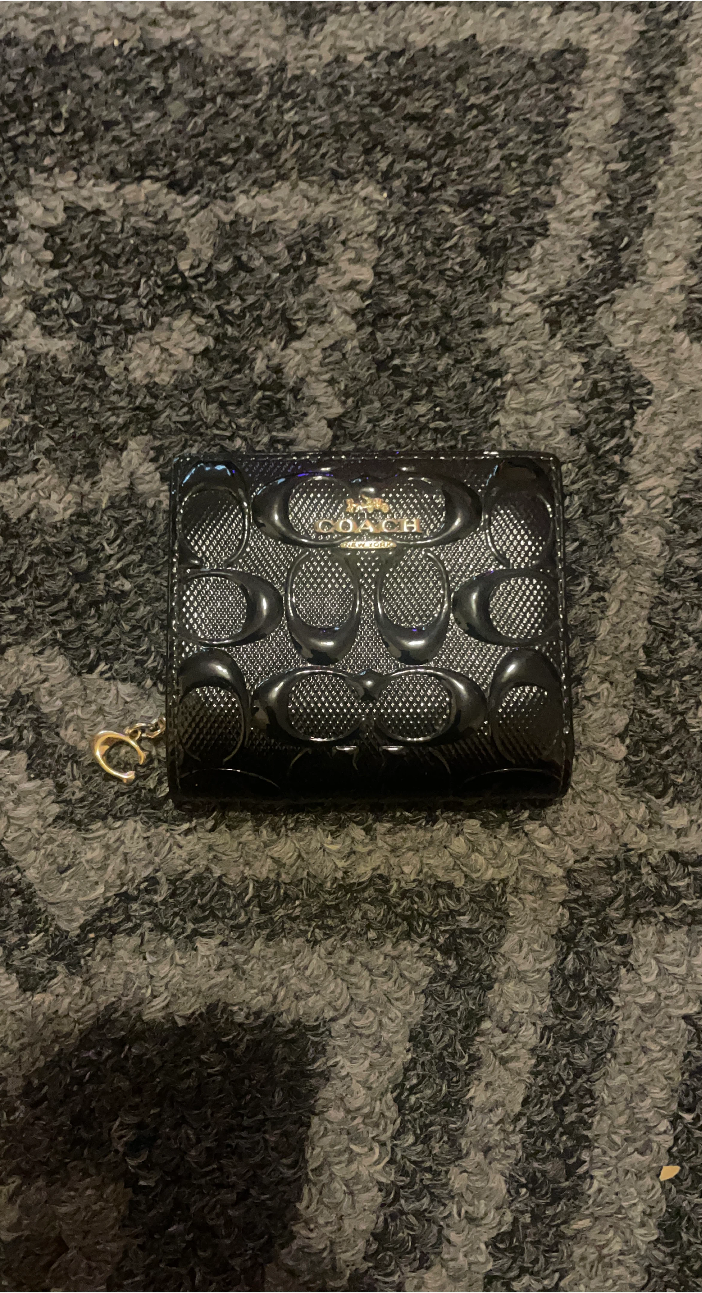 Joli petit portefeuille Coach de couleur noire. Il est parfait pour transporter vos cartes et votre argent avec style! Le design est classique et élégant, idéal pour toutes les occasions