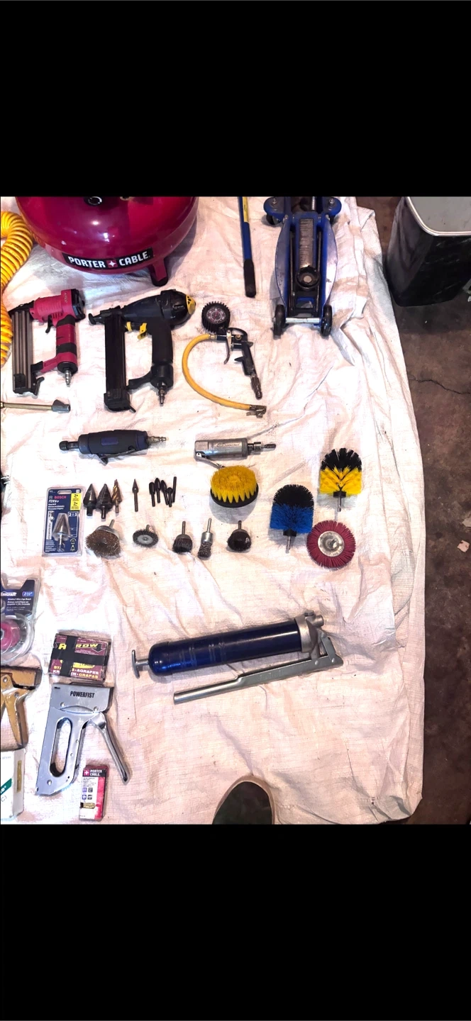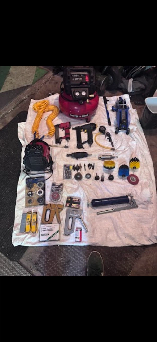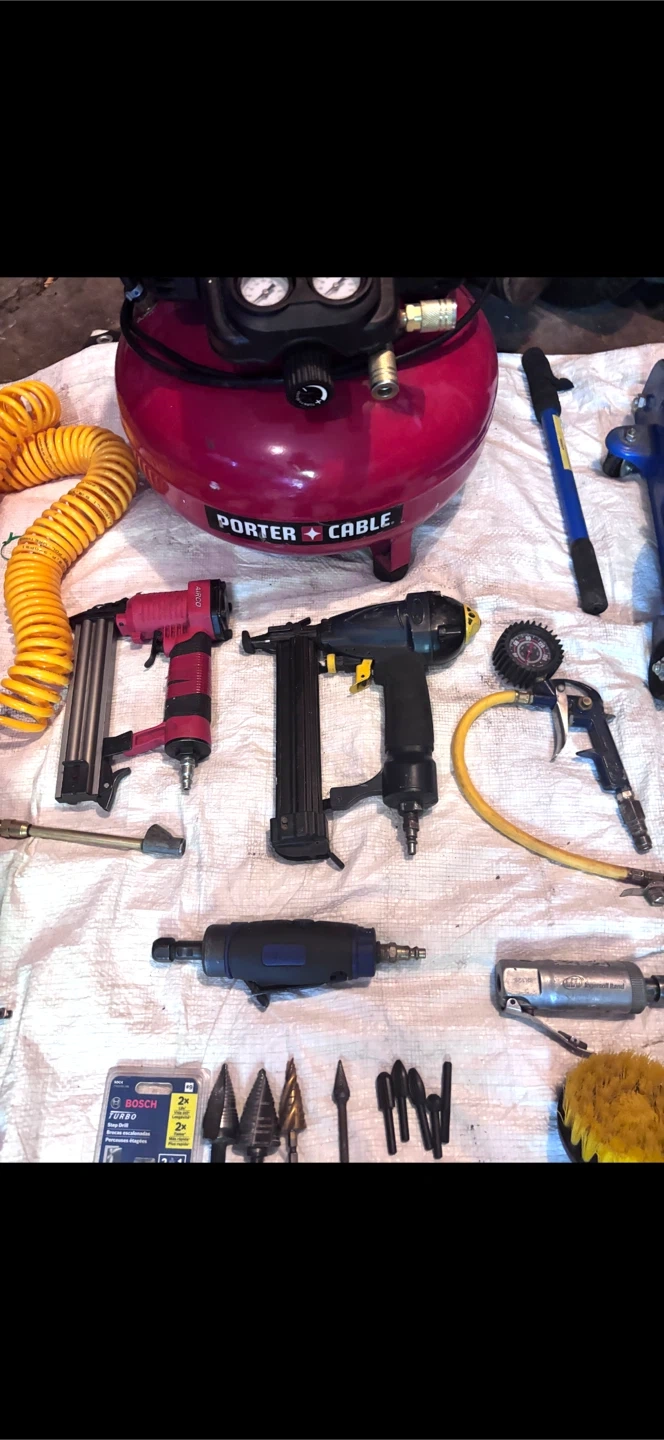 Here's a collection of tools, including a Porter Cable air compressor. It's a great set to have for various projects around the house or in the workshop. Porter cable air compressor Hose Airco staple gun Mastercraft Brad nailer Tyre inflater with gauge 2 die grinders and accessories 2 hand stapler’s and accessories 3 ton floor jack and handle Various packs of nails/staples