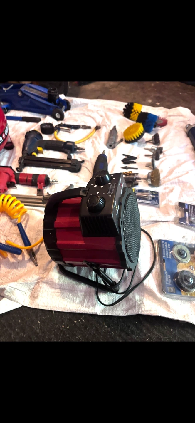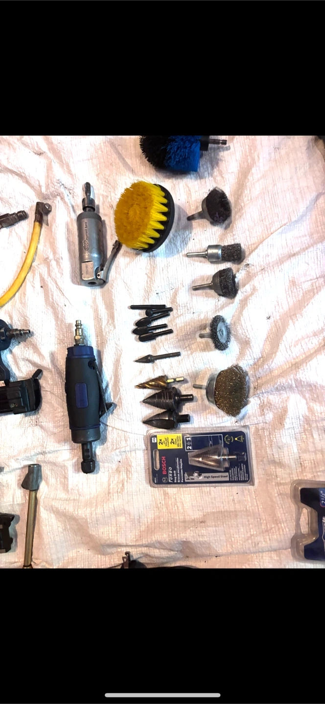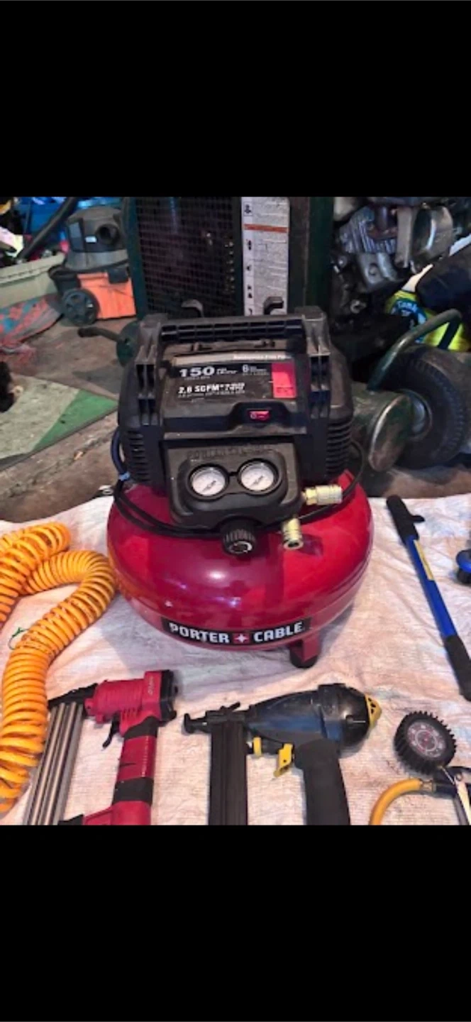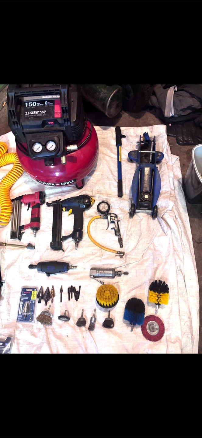 Here's a collection of tools, including a Porter Cable air compressor. It's a great set to have for various projects around the house or in the workshop. Porter cable air compressor Hose Airco staple gun Mastercraft Brad nailer Tyre inflater with gauge 2 die grinders and accessories 2 hand stapler’s and accessories 3 ton floor jack and handle Various packs of nails/staples