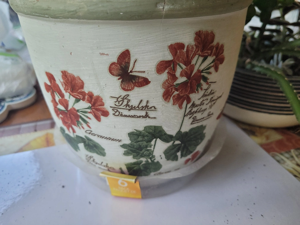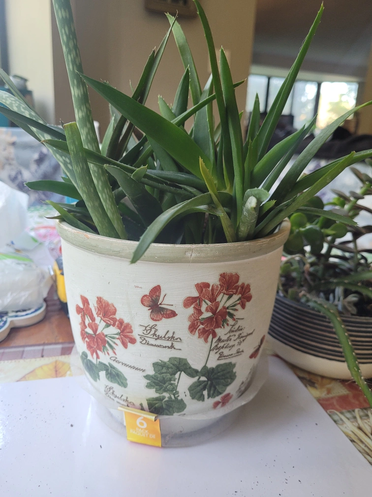 Selling a healthy Aloe Vera plant in a decorative pot! It's a great addition to any home or office space. The pot has a floral and butterfly design, adding a touch of charm.