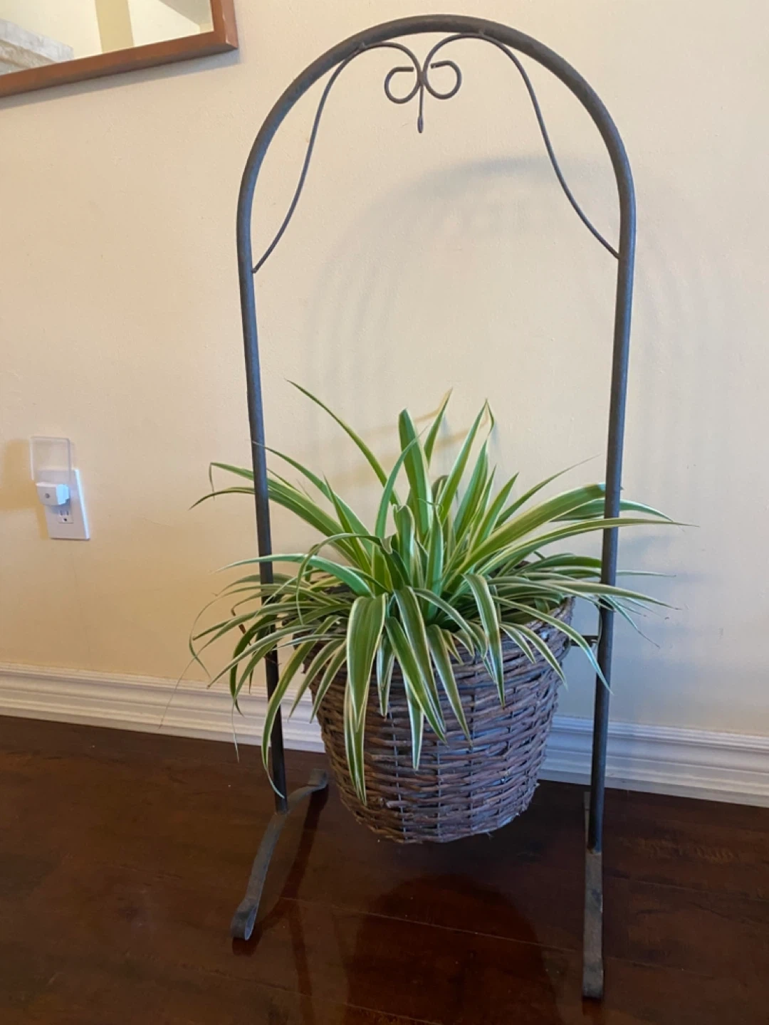 Selling a healthy spider plant in a woven basket pot, complete with a decorative metal stand. It's a great way to add some greenery to your space!